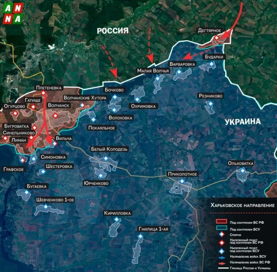 ак, передовые российские военные подошли к восточной окраине и заняли часть Нестерного - это населённый пункт в 5 км от Дегтярного. В перспективе наступление ВС РФ здесь поможет зачистке левого берега реки Волчья и высвободит силы для развития наступления на юг от Волчанска Харьковской области.