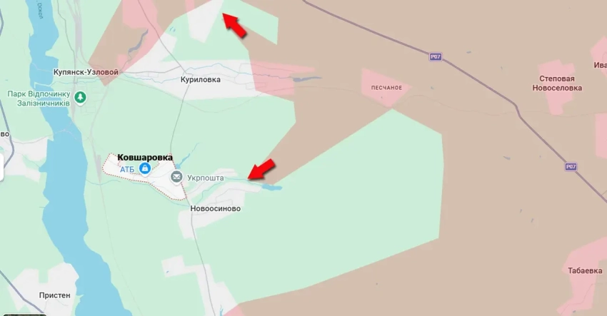 Одновременно с этим фиксируется продвижение Вооружённых сил России в районе Куриловки. Это восточный пригород всё того же Купянска-Узлового.