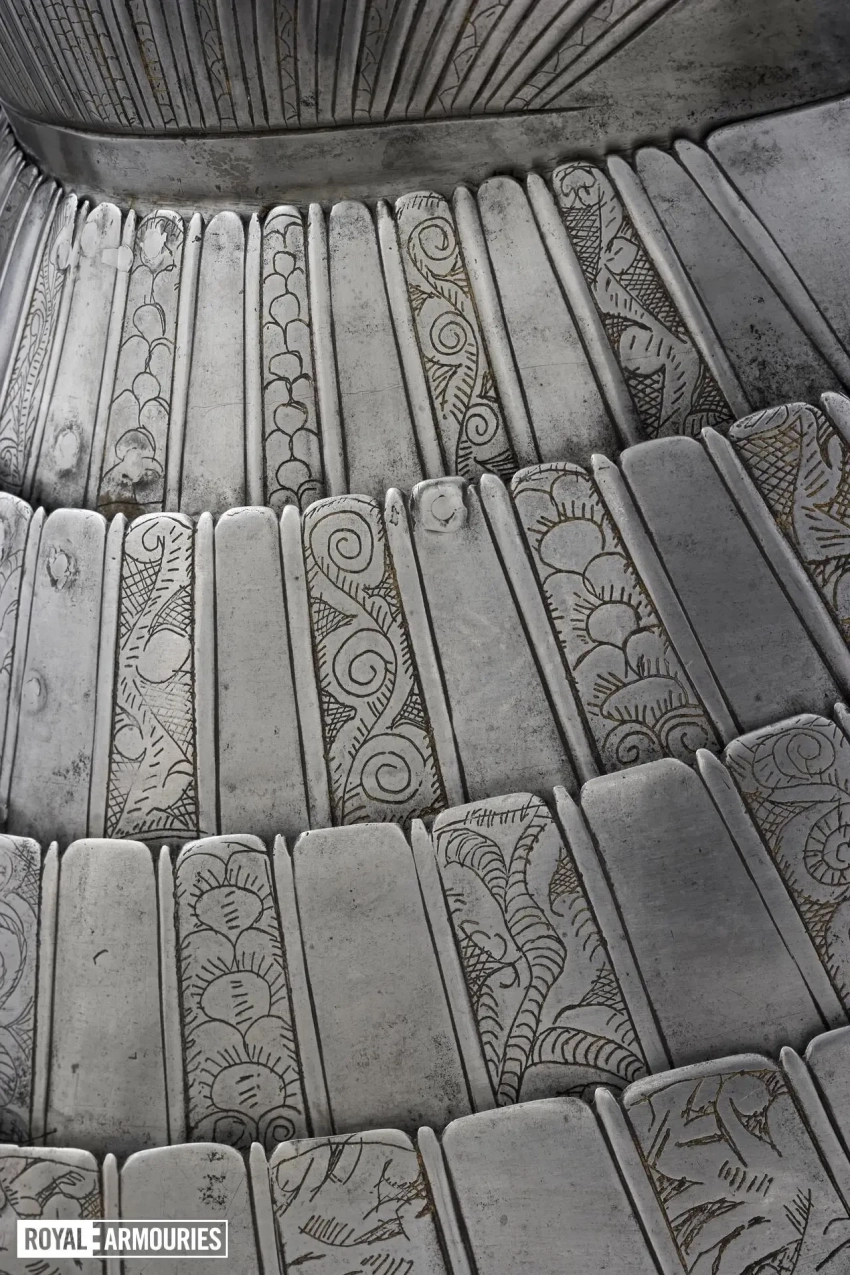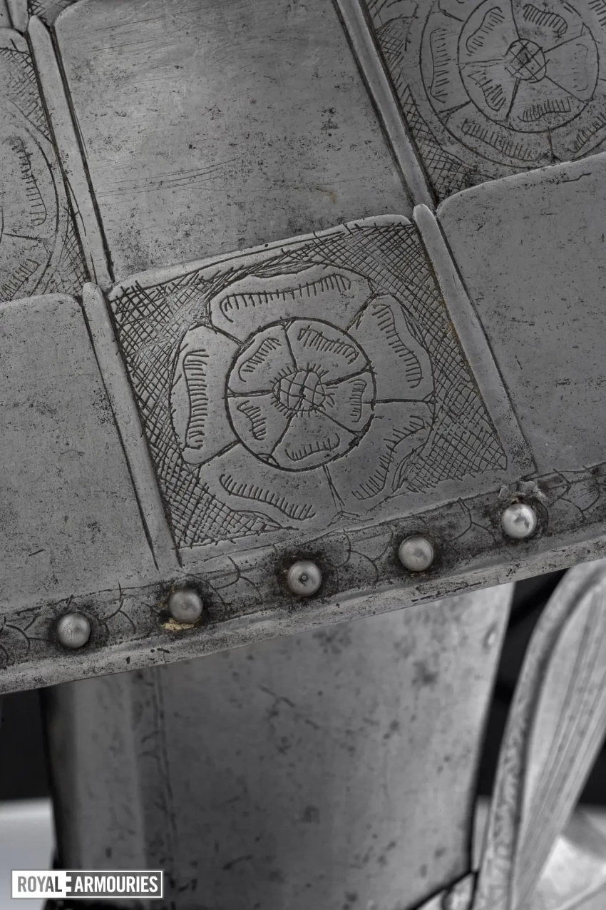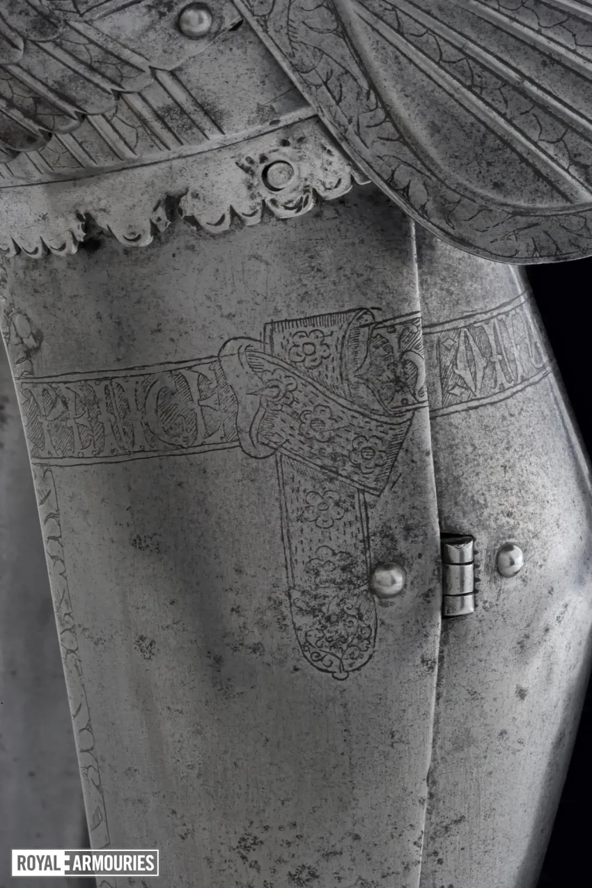Наплечники из перекрывающих друг друга пластин стали отличительной особенностью мастерской в Гринвиче. Левый (если смотреть спереди) наплечник состоял из восьми полос, а вот правый почему-то из семи. Юбка состоит из девяти полос, как спереди, так и сзади. Петли на ней находятся слева, пряжки ремней справа. Латы для ног могли быть изготовлены в Италии или во Фландрии. Их попросту взяли от какого-то старого доспеха.