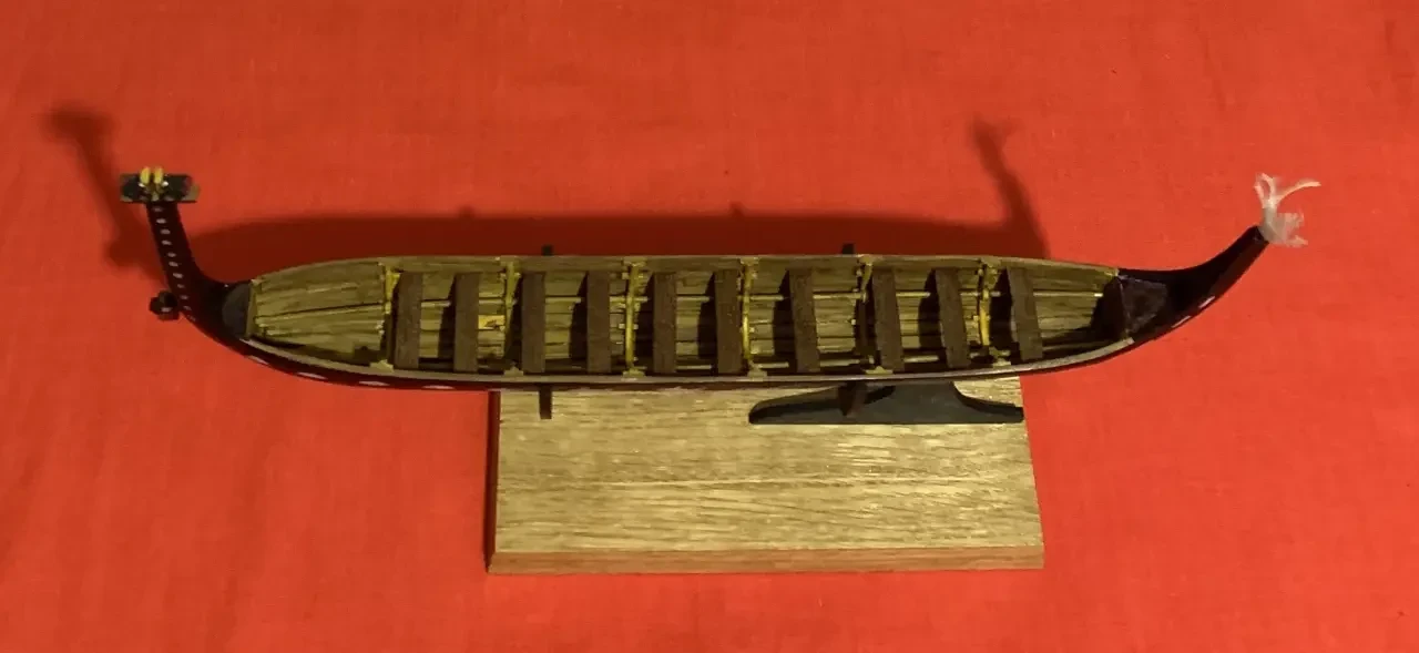 Много работы было с установкой декоративных шпангоутов. Мало того, что в сечении они полукруглые, так под них еще и короткие деревянные отрезки подложены. И всё это надо сделать аккуратно! Для самих шпангоутов использовались полистироловые прутки шириной 2 мм, а отрезки под них — из таких прутков той же толщины фирмы «СВ-модель». Два продольных стрингера — железные прутки диаметром 1,5 мм с надетыми на них полистироловыми колечками там, где они касаются шпангоутов. Если уж очень понадобится, то в Интернете можно найти фотографии с внутренним видом таких пирог. 10 штук таких шпангоутов сразу же после склеивания нужно осторожно выгнуть, например, с помощью паяльника, поставленного на самый слабый нагрев (можно еще и бумагой обернуть!), и сразу вставить в корпус. С другой стороны, наверное, если у тебя «модель для себя», то можно их и не делать, ограничившись лишь поперечными банками для гребцов.