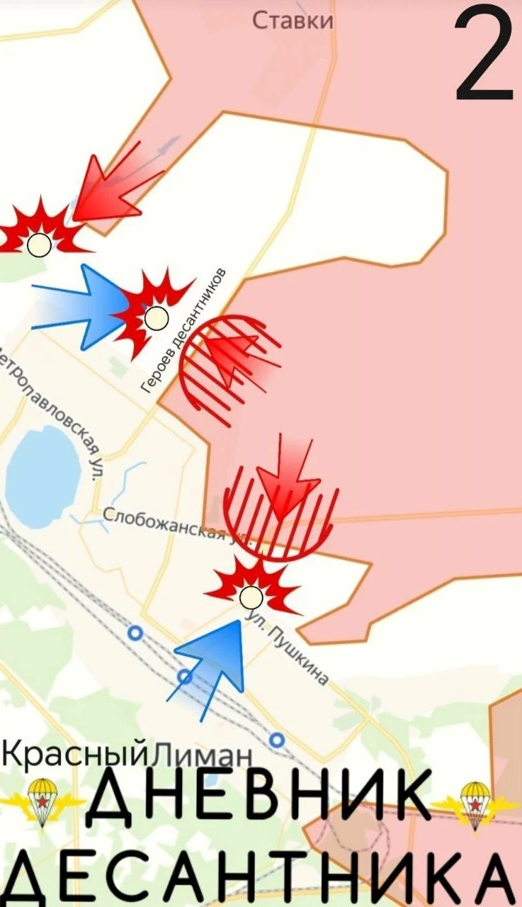 Внутри Красного Лимана российские войска выбили противника из укрепленного района и расширили зону контроля в переулке Героев Десантников. Продвижение также идет в сторону улицы Советская (Слобожанская), а улица Казацкая уже находится под нашим контролем.