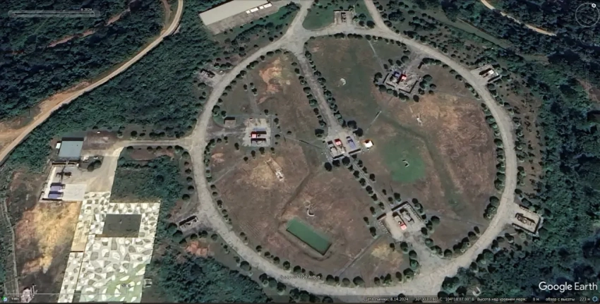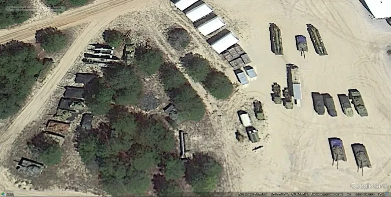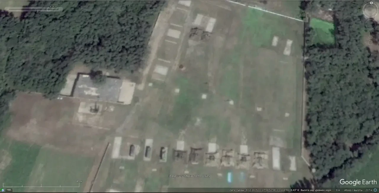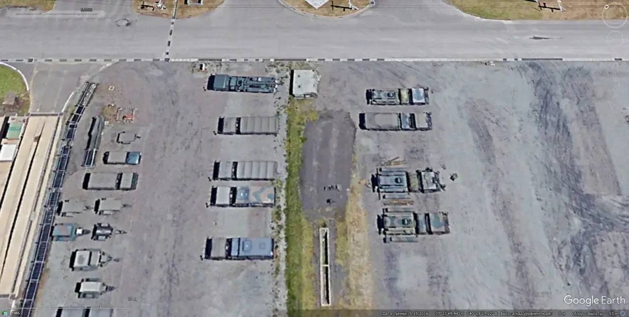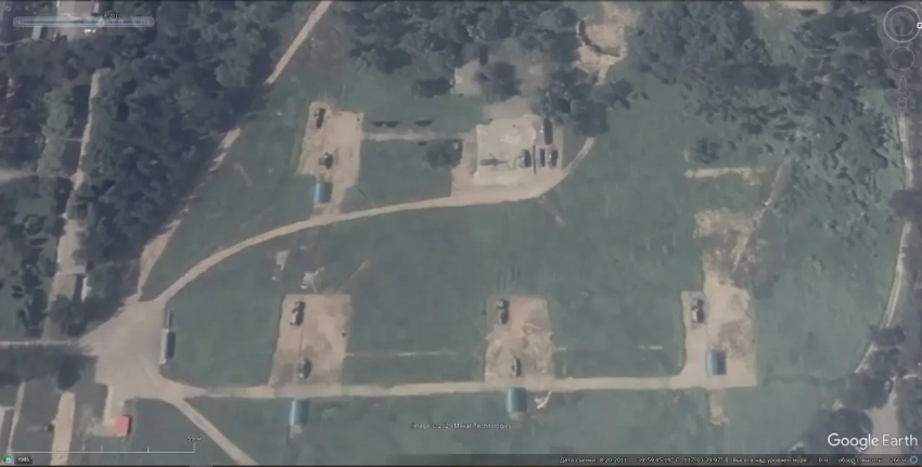 Спутниковый снимок Google Earth: ЗРК «Оса», мобильная пусковая установка ОТРК 9К72 «Эльбрус», СПУ 2П25 и СУРН 1С91 из состава ЗРК «Куб», между БТР-70 стоит ЗСУ-23-4. Позади на площадке имитаторы режимов работы СНР советских ЗРК. Снимок сделан в декабре 2016 года