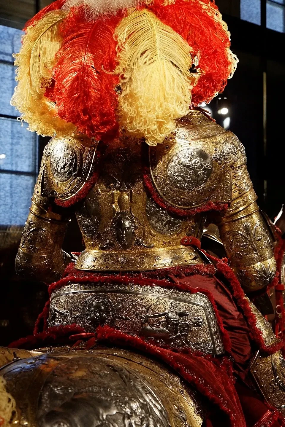 Этот же доспех. Вид сзади. На спине у кирасы и на наплечниках видны выполненные чеканкой изображения сцен из Троянской войны