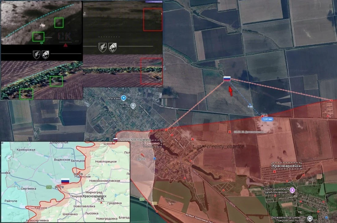 В Гришино идут бои в северной части села. Противник предпринимает контратаки на юго-западе. Севернее Удачного российские подразделения продвигаются к окраинам Сергеевки вдоль улицы Рокотянского.