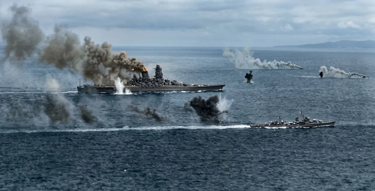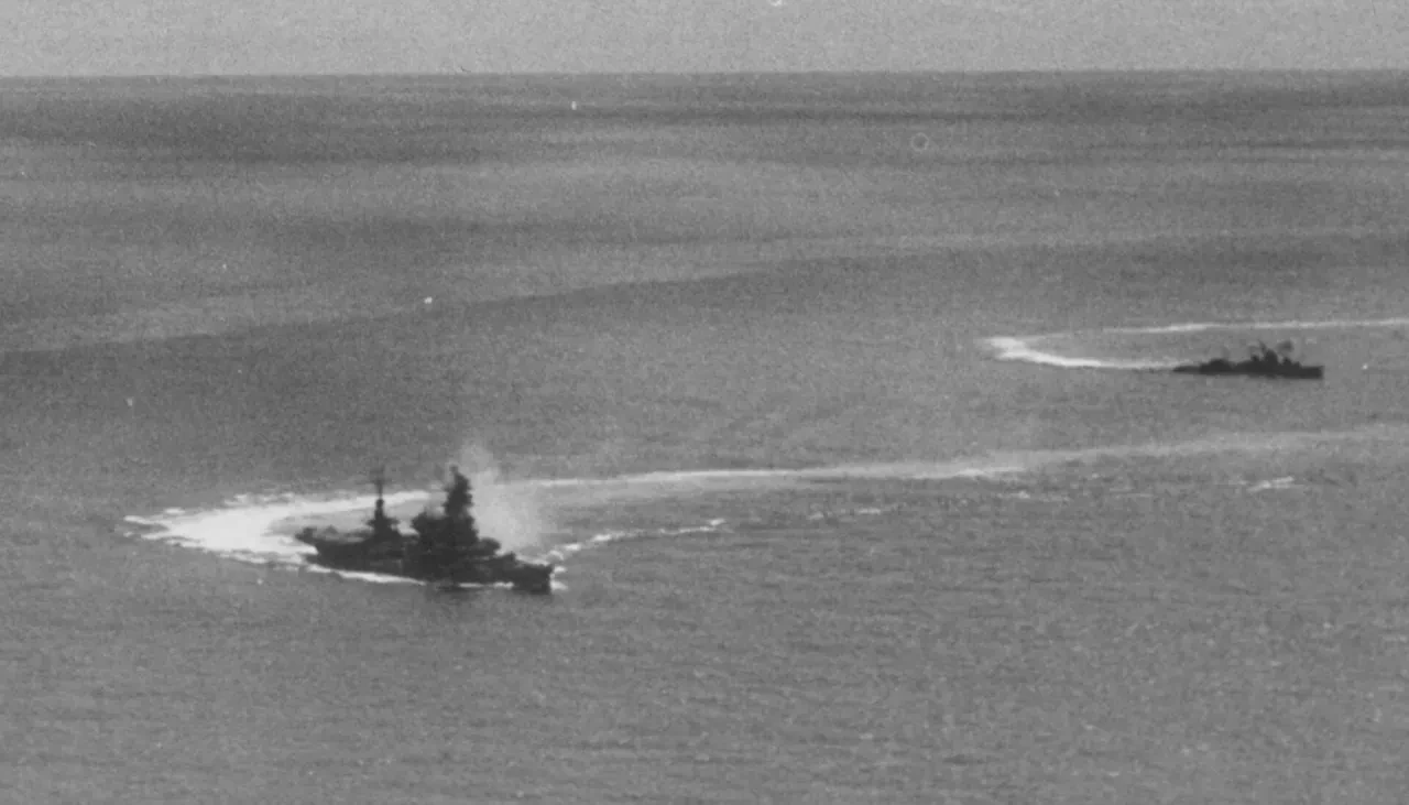 «Дзуйкаку» и «Вакацуки» под обстрелом во время битвы в заливе Лейте, 25 октября 1944 года