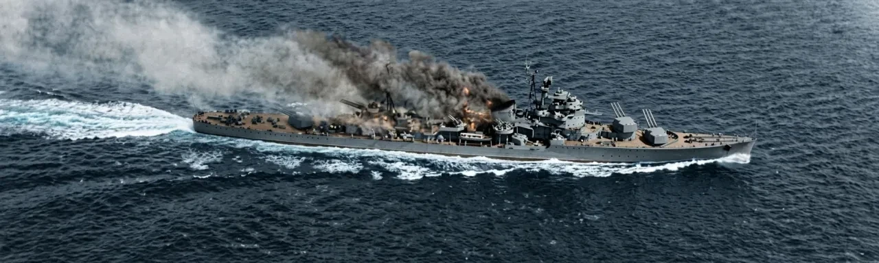 В 13:08, когда первая волна авианалётов подходила к концу, 150-килограммовая бомба, сброшенная с SB2C Helldiver с авианосца «Эссекс» (CV-9), попала в переднюю часть мостика, пробив большую дыру в полубаке, на верхней палубе и в правом борту. Башни № 1 и № 2 получили серьёзные повреждения, и все отсеки, кроме боезапаса в башне № 1, были затоплены.