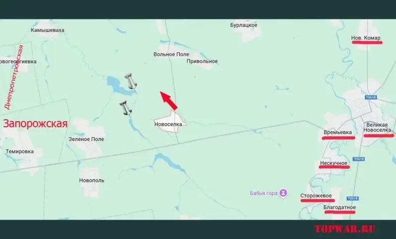 Расстояние до Днепропетровской области сокращается: армия России продвигается северо-западнее Новосёлки - к реке Вороная