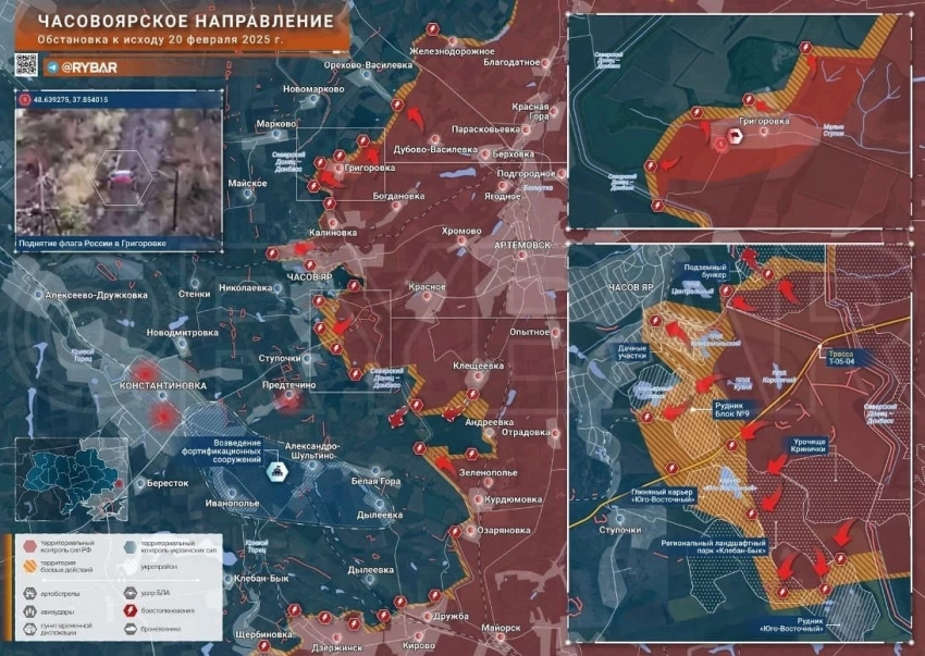 На Часовярском участке городские бои в южной части Часов Яра. Сообщают об освобождении Григоровки на северном фланге, а также продвижении широким фронтом в районе Курдюмовки и Андреевки.