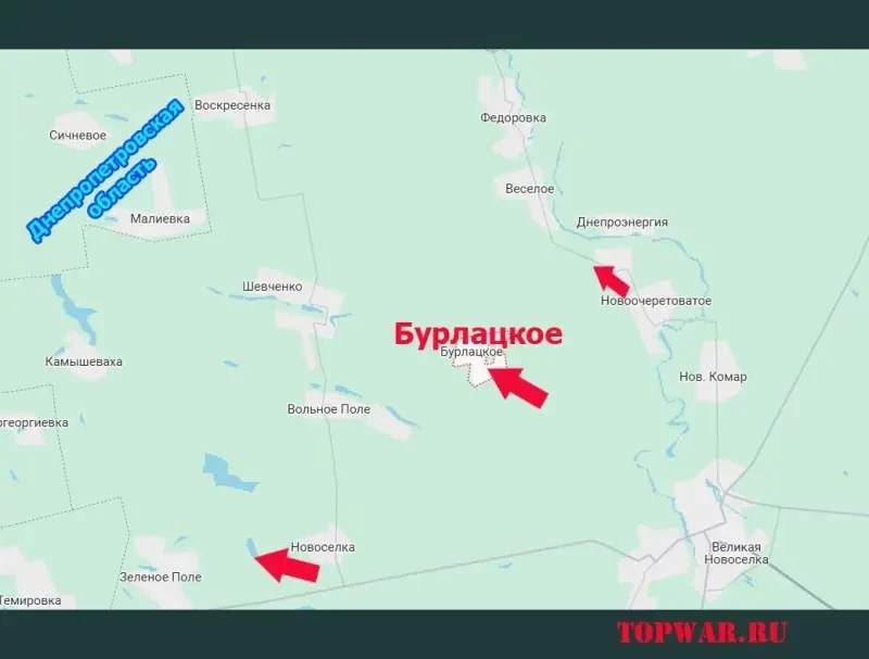 С этого направления поступают сведения о том, что Вооружённые силы России продвинулись на расстояние до 1 км и вошли в село Бурлацкое. Оно располагается примерно в 7,5 км от Великой Новосёлки и на таком же расстоянии от границы Днепропетровской области.
