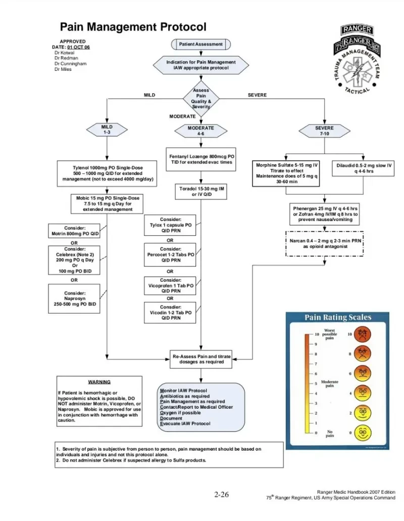 В июне 2024 года опубликовано пособие для ВС РФ: «Временные Указания По Применению Анальгетиков» — май 2024 (Рис. 1). Пособие создано под влиянием алгоритма аналгезии из современной версии ТССС (Tactical Сombat Сasualty Сare) (Рис. 2).