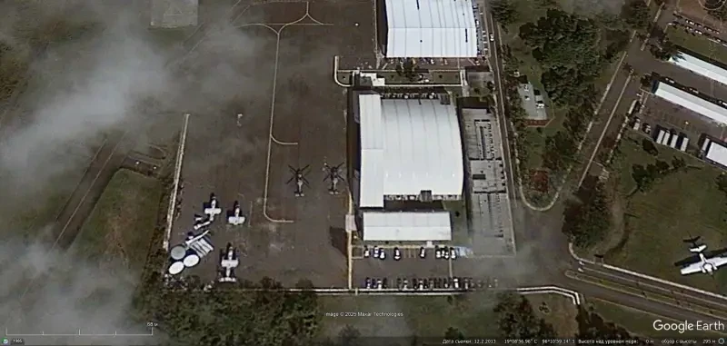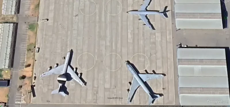 Спутниковый снимок Google Earth: разобранные самолёты E-2C на авиабазе Лас-Бахадас