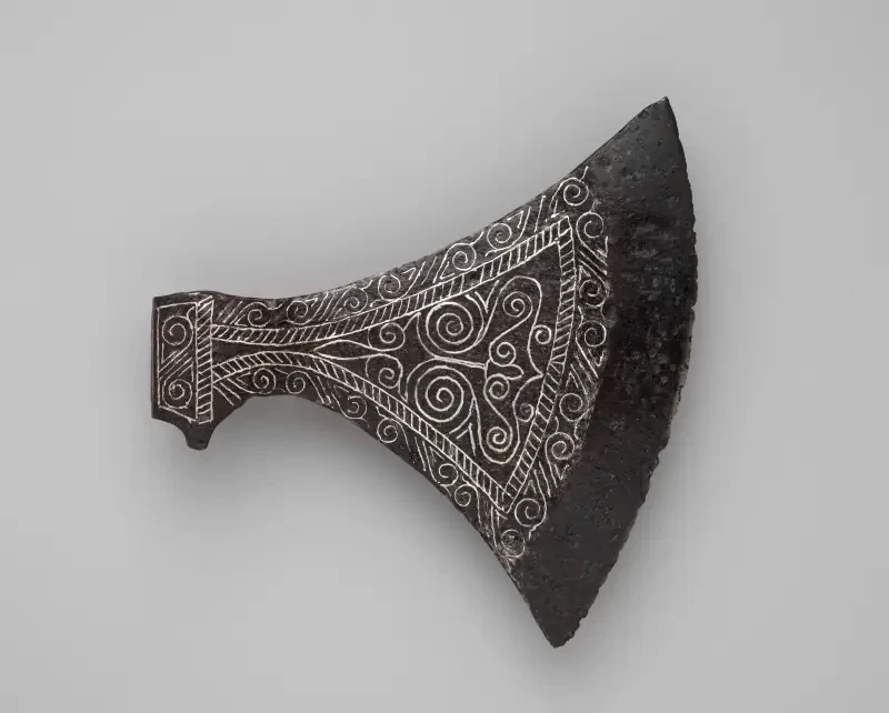 Боевой топор скандинавов XI-XII вв. Инкрустация выполнена серебряной проволокой. Длина 18,7 cм, ширина 19,1 cм, вес 520 г. Метрополитен музей, Нью-Йорк