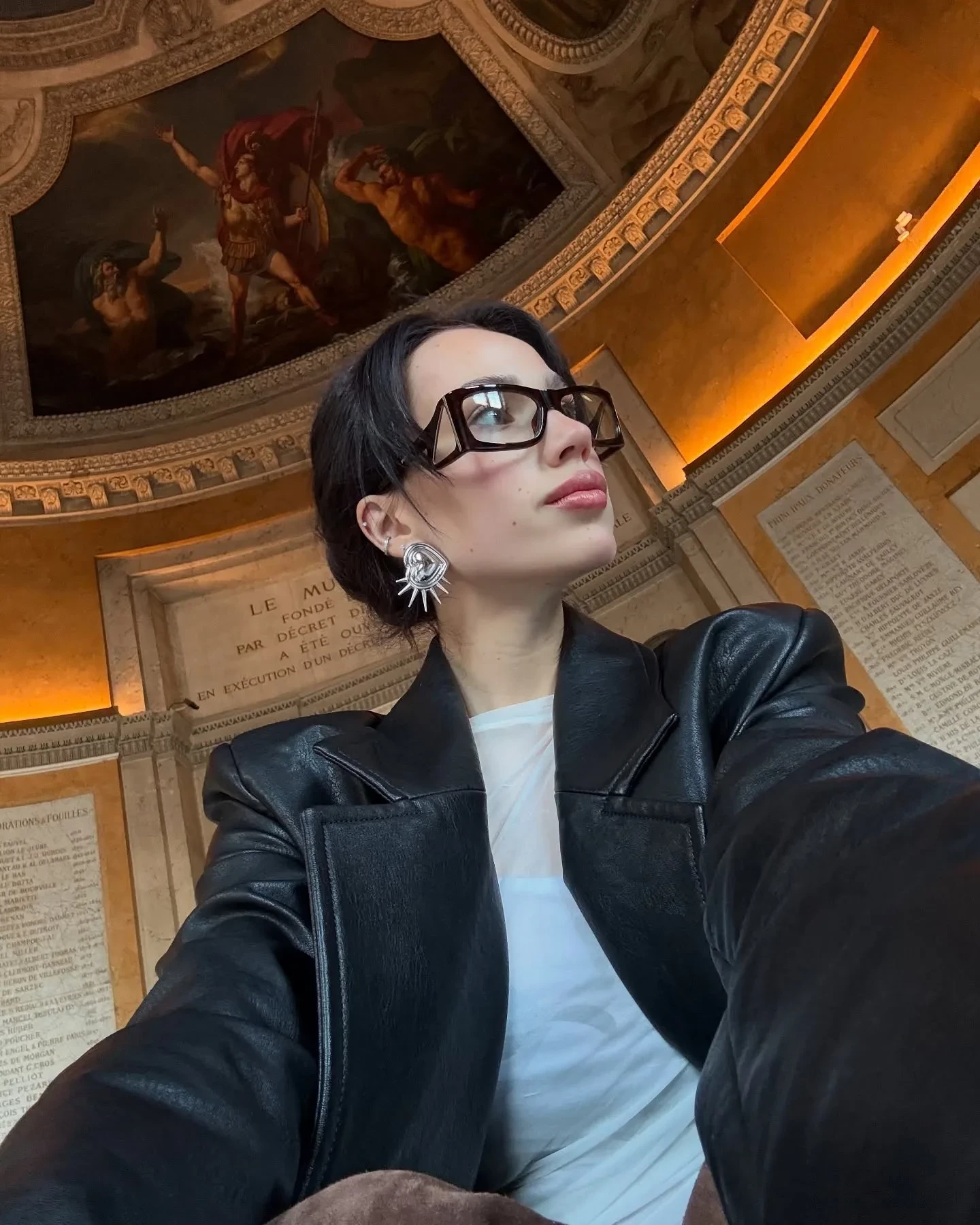 На фото Загитова позирует на фоне знаменитого полотна Паоло Веронезе "Брак в Кане Галилейской", а также рядом с картиной Леонардо да Винчи "Мона Лиза", где попыталась воспроизвести знаменитую улыбку "Джоконды". Для посещения музея спортсменка выбрала полупрозрачную майку, трендовые коричневые ботфорты и очки в толстой оправе.