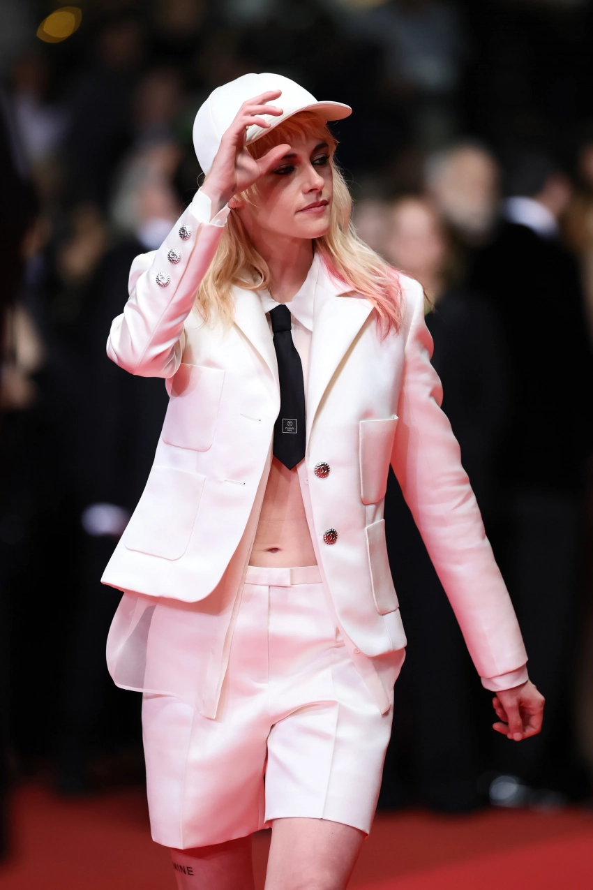 35-летняя актриса появилась на специальном показе в чёрно-белом костюме от Chanel, который она дополнила чёрными туфлями на каблуке, надетыми на белые носки, и кепкой. Волосы, цвет которых Стюарт недавно изменила, были уложены в небрежном стиле.