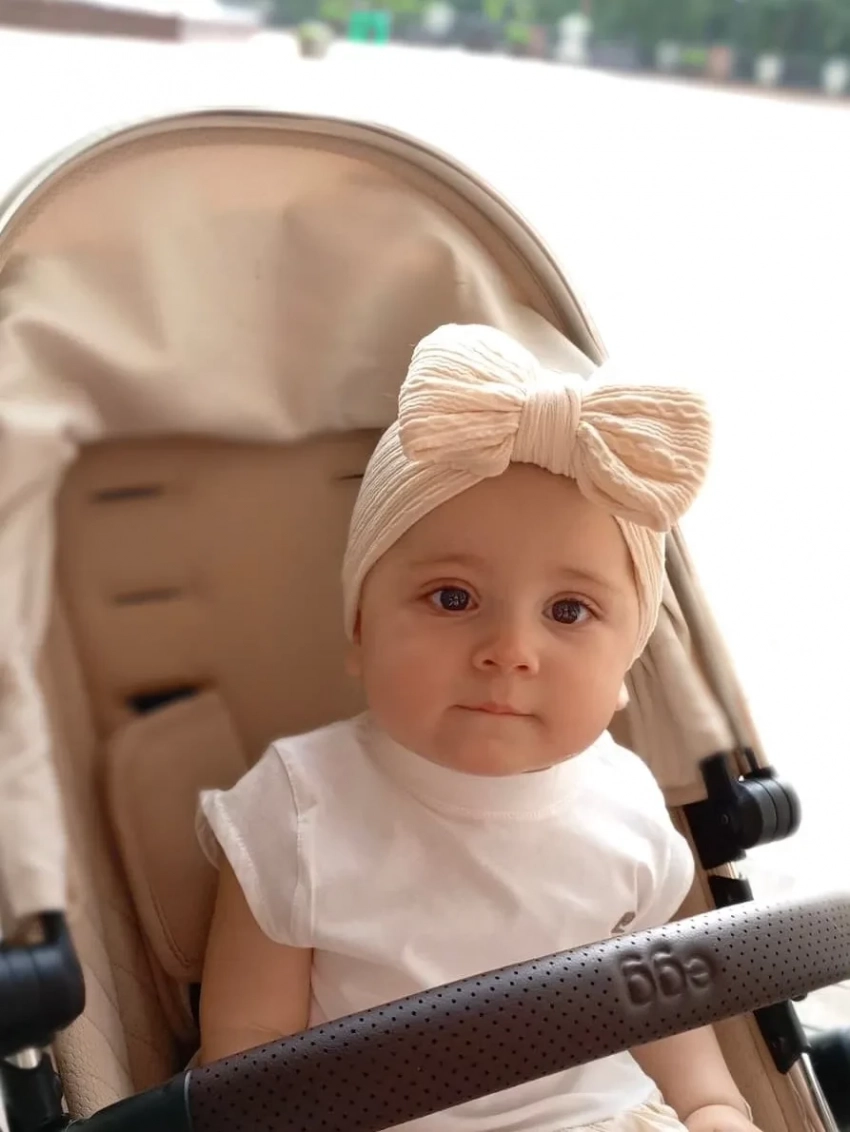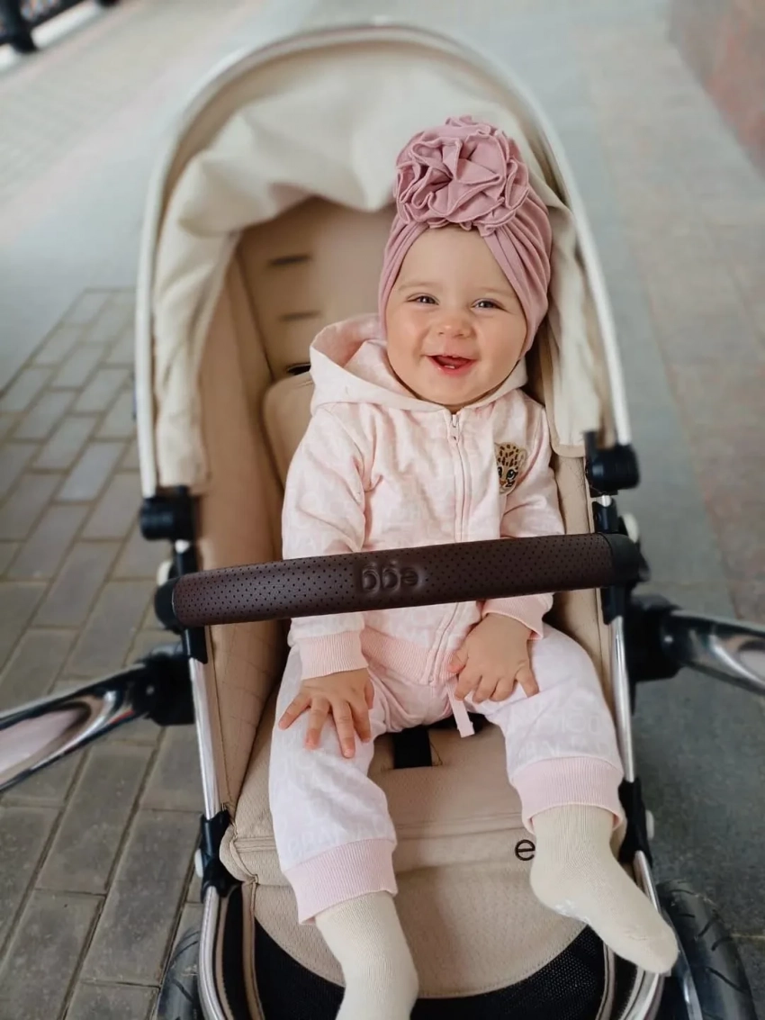 Елизавета Арзамасова опубликовала в соцсетях новые фото 10-месячной дочери Лии от супруга Ильи Авербуха. На снимках младший ребёнок знаменитостей позирует в коляске в розовом костюме и белой футболке.