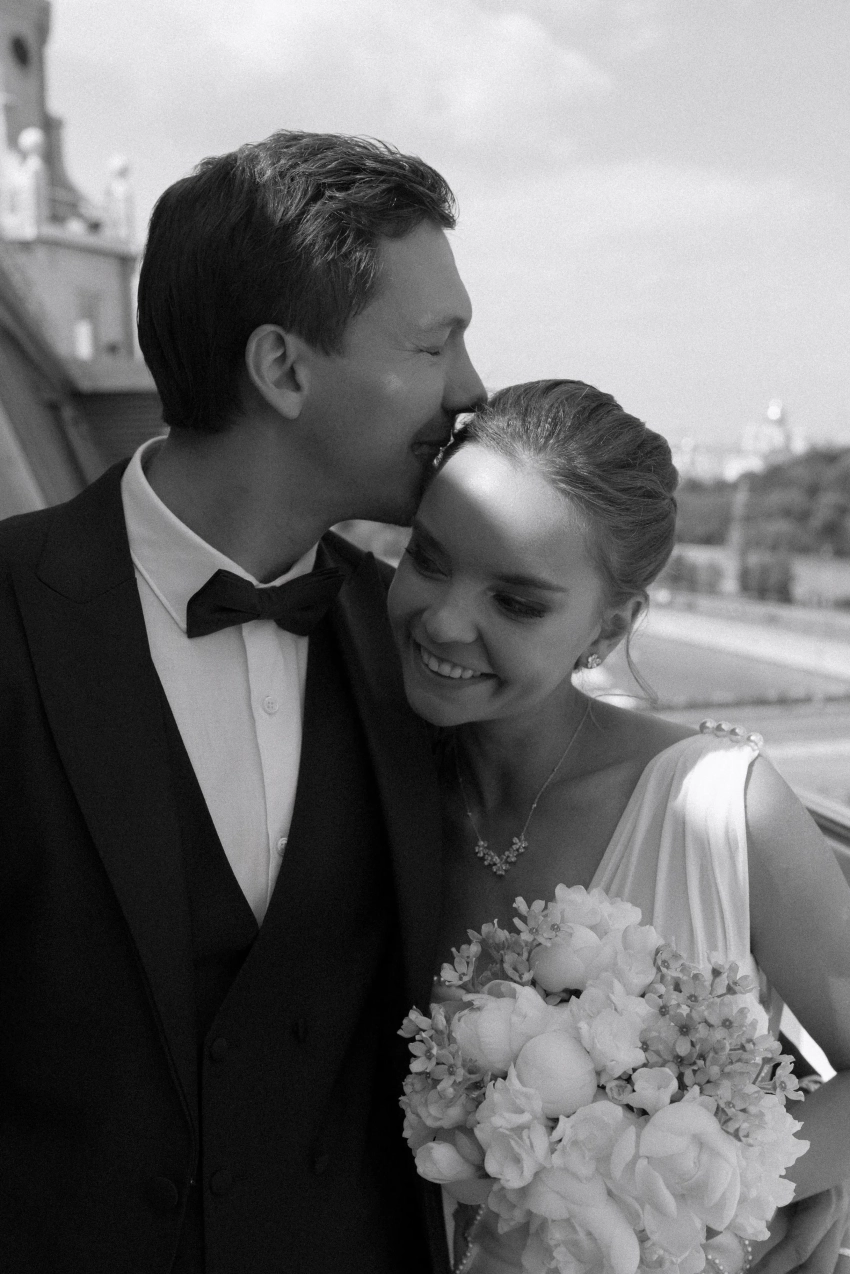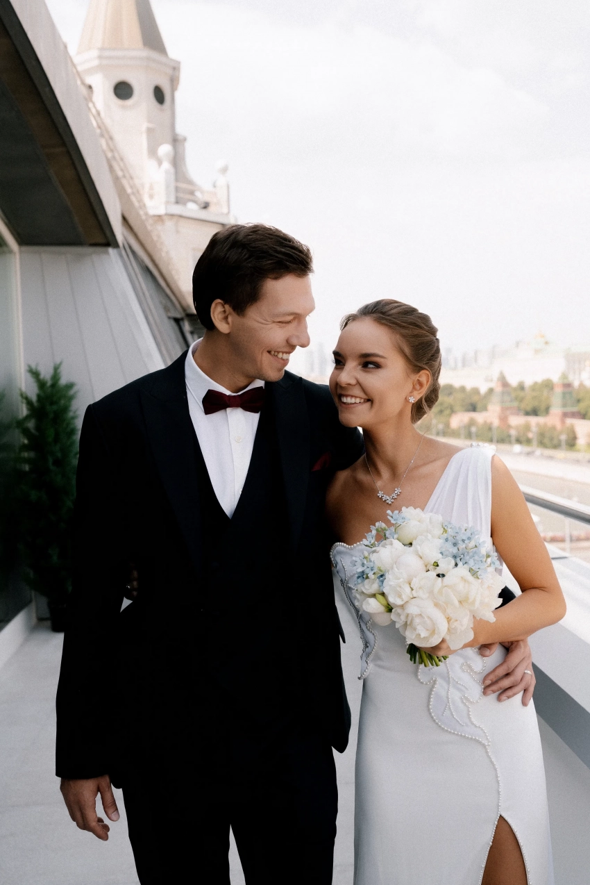 Сегодня в сети появились новые снимки со свадебной фотосессии и из ЗАГСа: фотосессия молодожёнов прошла в отеле "Балчуг Кемпински". На снимках невеста позирует в платье с разрезом бренда "Хохлома x Алёна Ахмадуллина" и в украшениях Mercury.