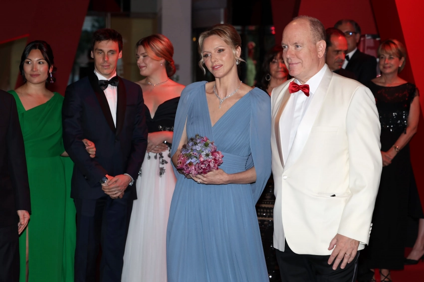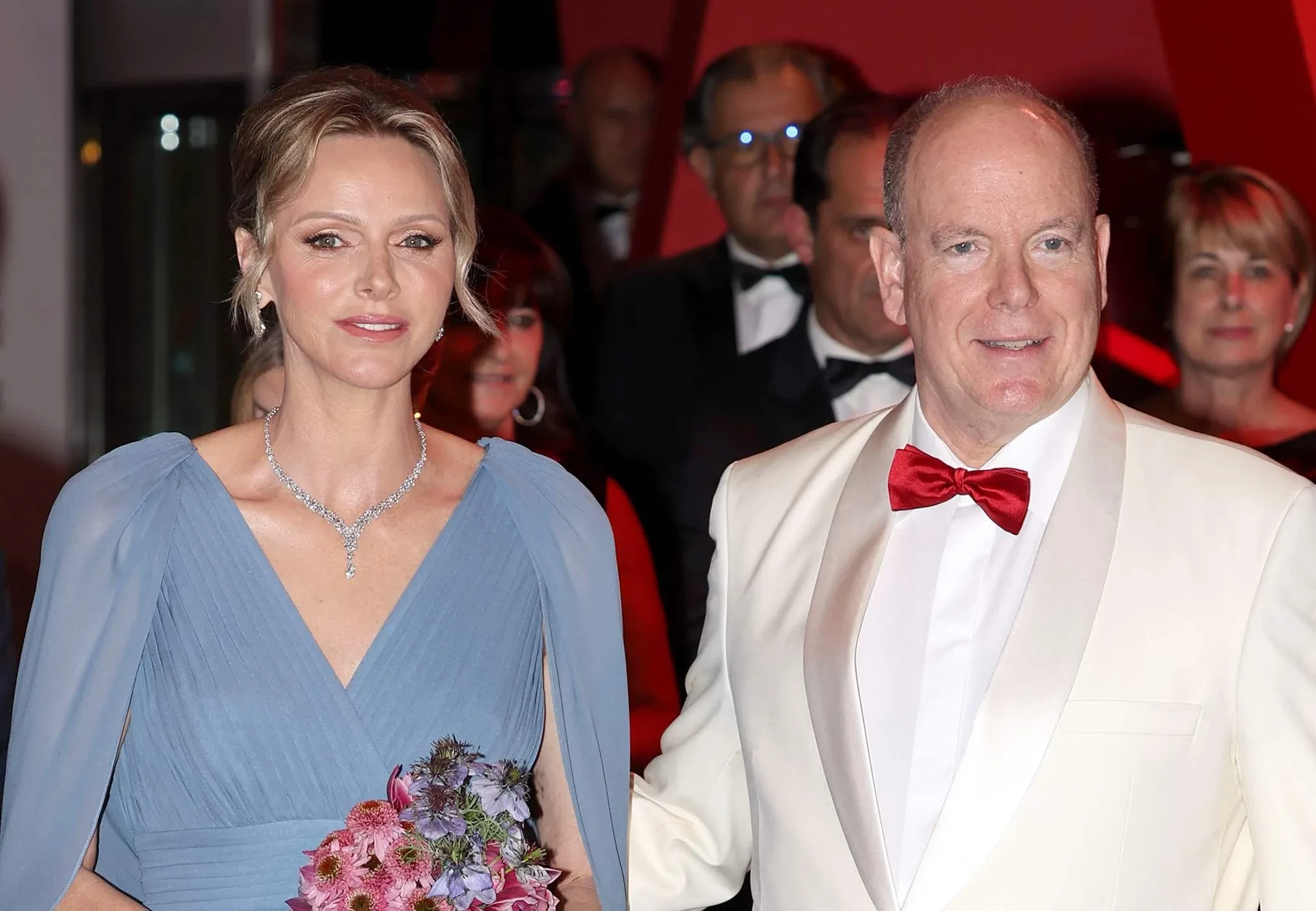 В этом году 47-летняя Шарлен появилась на мероприятии в серо-синем платье в пол Elie Saab. Образ княгини дополняли дорогие украшения и букет из синих и фиолетовых цветов. Альбер был в черных брюках и белом смокинге, а яркой деталью образа, как всегда, стал красный галстук-бабочка.