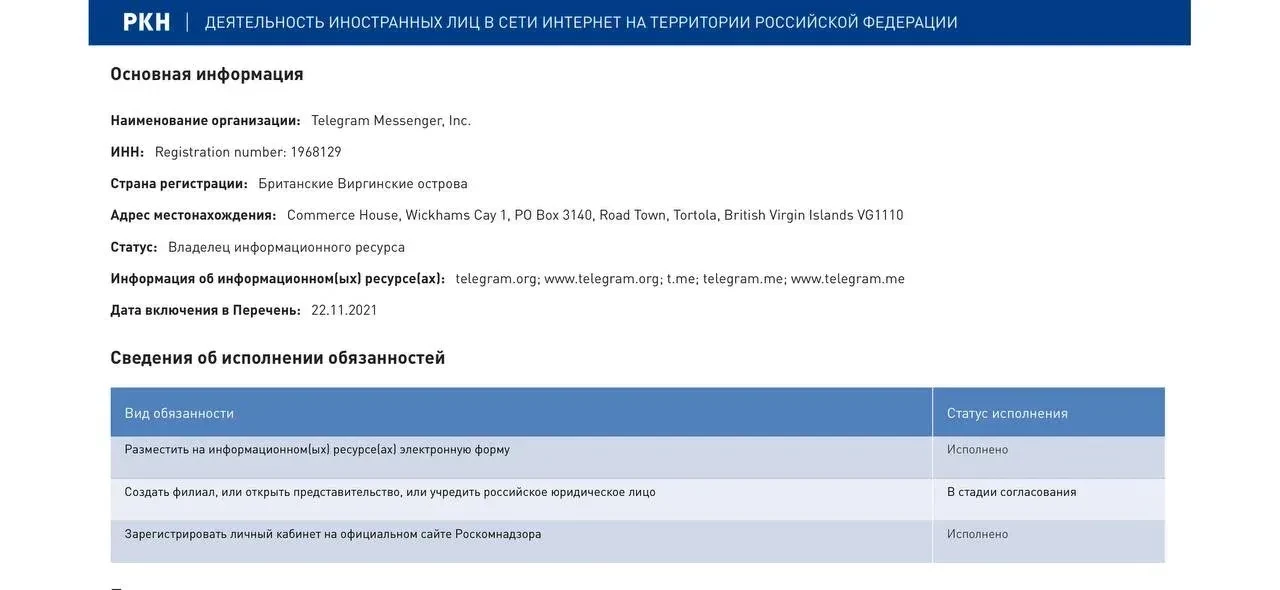 Ранее издание Hi-Tech Mail сообщило со ссылкой на реестр Роскомнадзора, что Telegram якобы готовит открытие представительства в рамках закона о "приземлении" (он требует от крупных иностранных IT-компаний с аудиторией более 500 тыс. пользователей в России зарегистрировать юрлицо и наладить обратную связь с пользователями). По заявлению СМИ, процесс уже находится в стадии согласования.