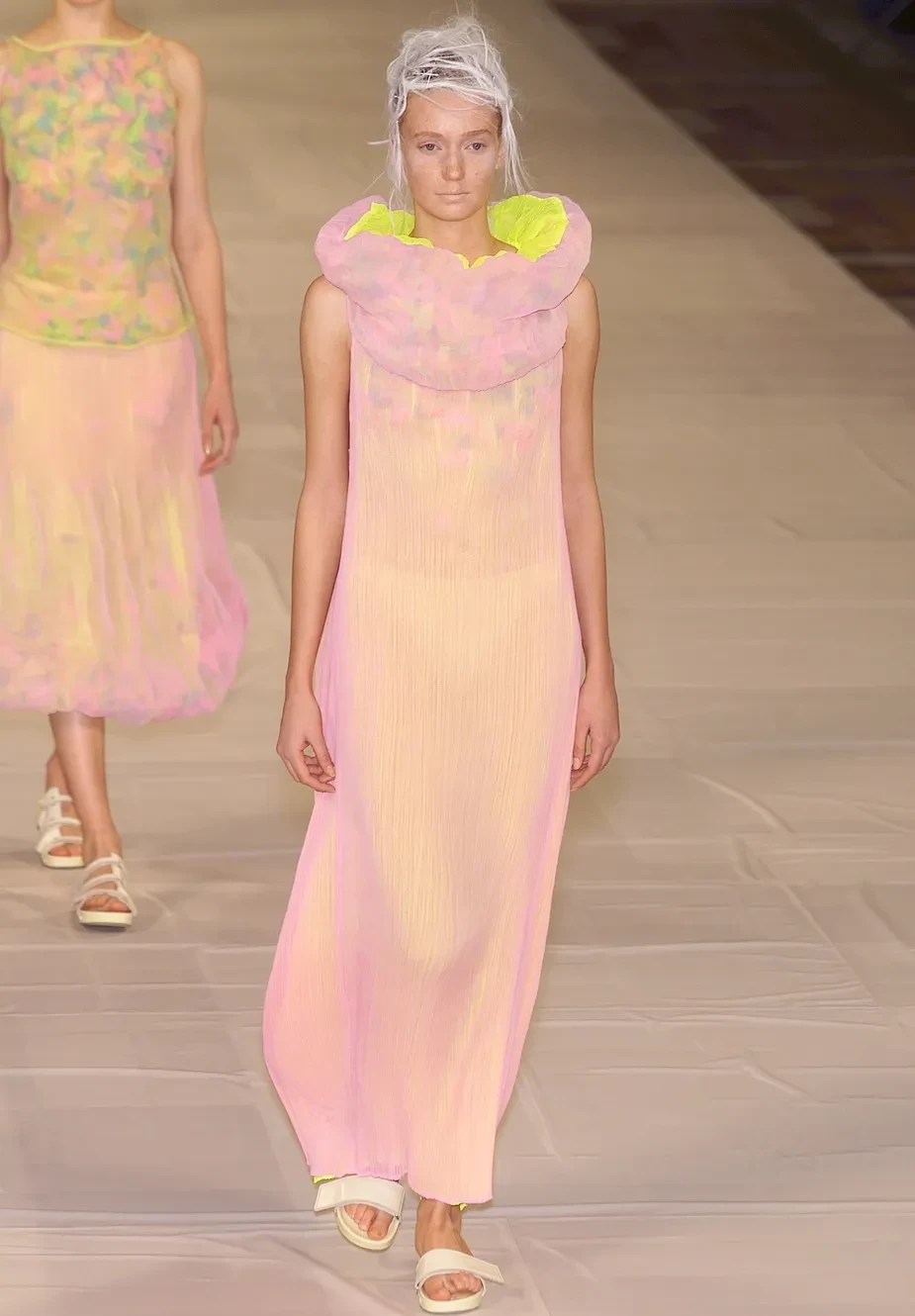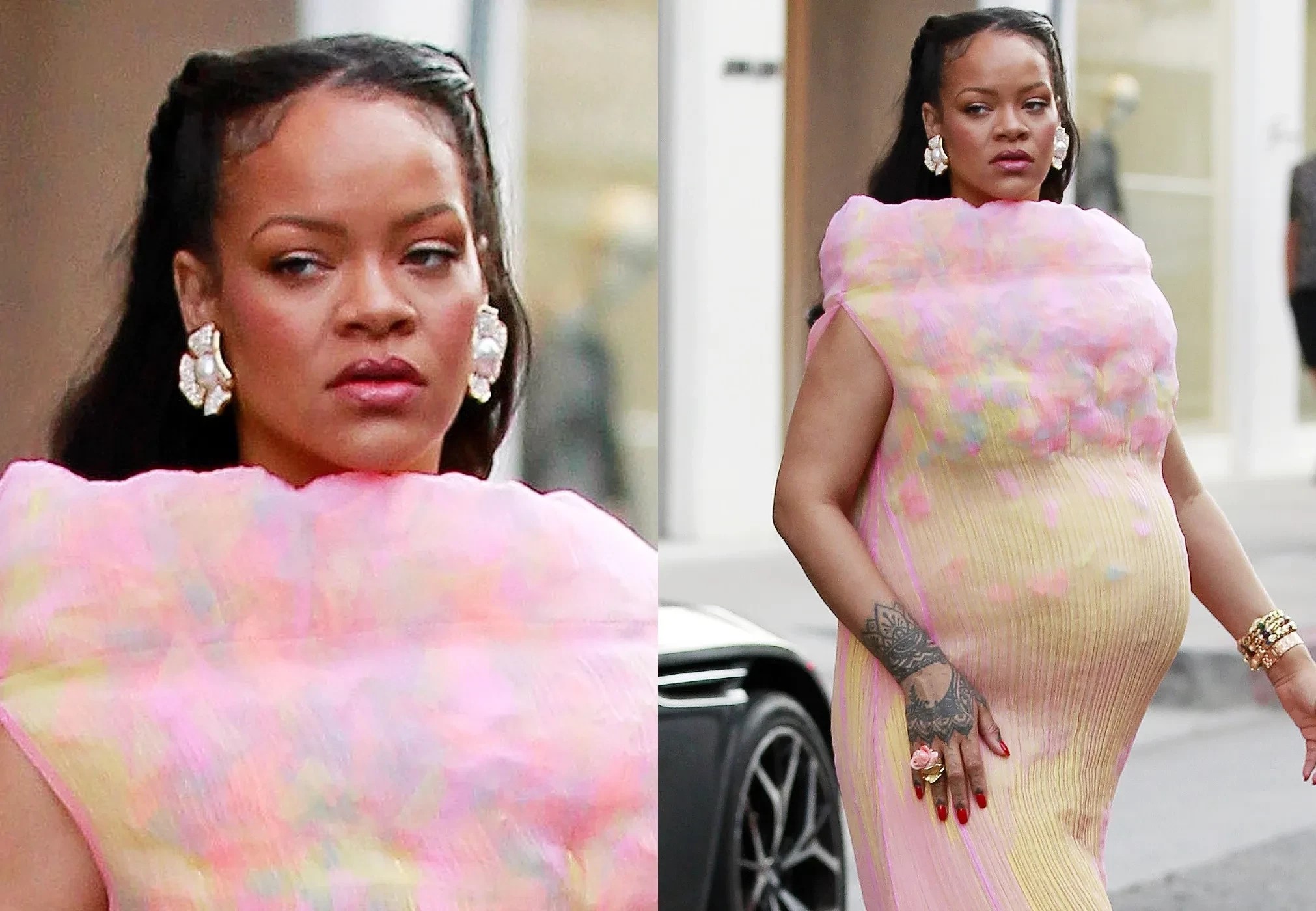 Беременная третьим ребёнком Рианна появилась на публике в новом модном образе. 37-летняя певица попала в объективы папарацци в Лос-Анджелесе, когда прогуливалась по улице в винтажном платье Issey Miyake из летней коллекции 2001 года, напоминающем сахарную вату (хотя, возможно, цветом платья певица намекает, что у неё будет девочка?). Звезда дополнила образ кроссовками Puma x Ottolinger в серебристо-зелёных оттенках и массивными серьгами.