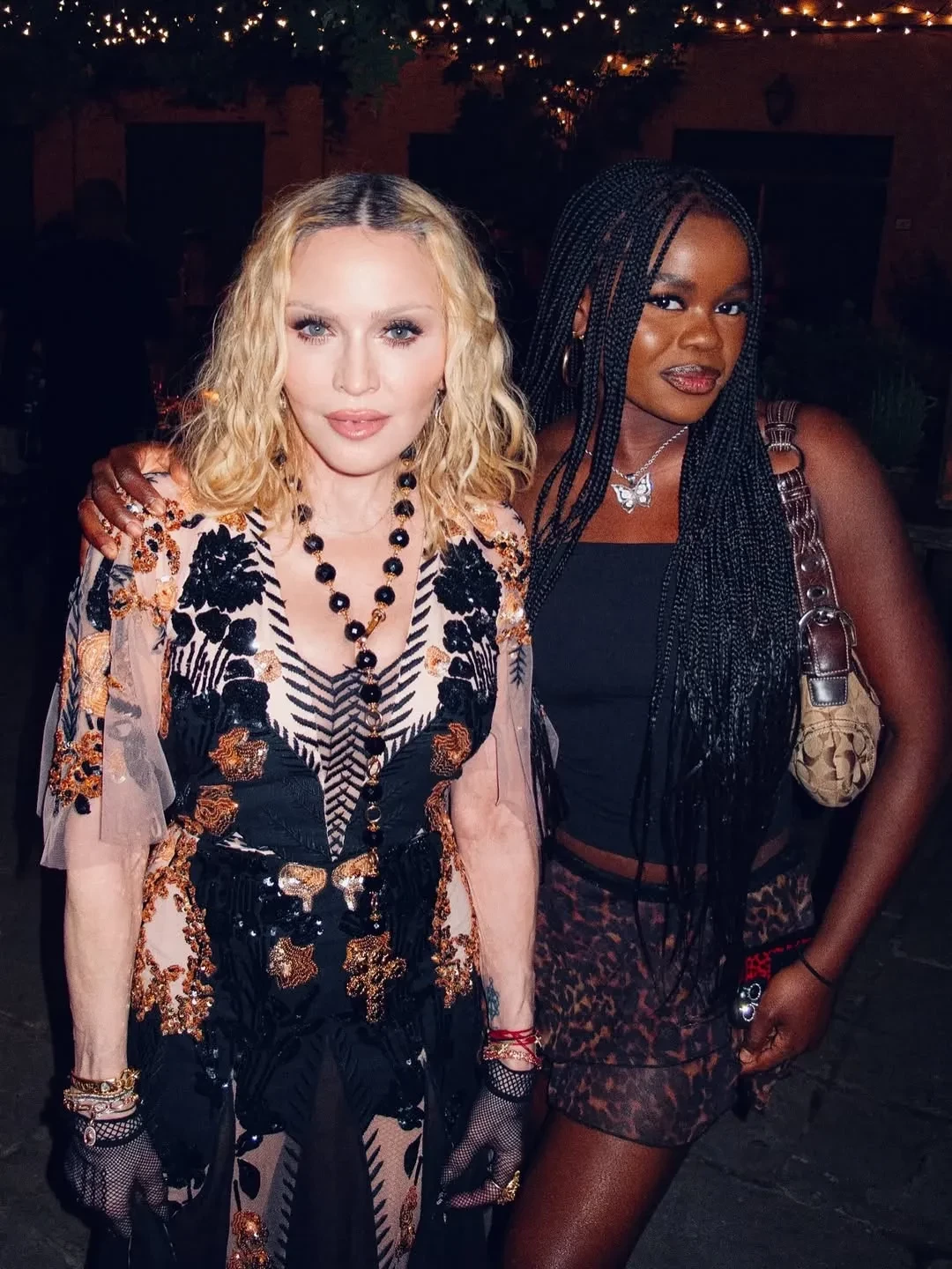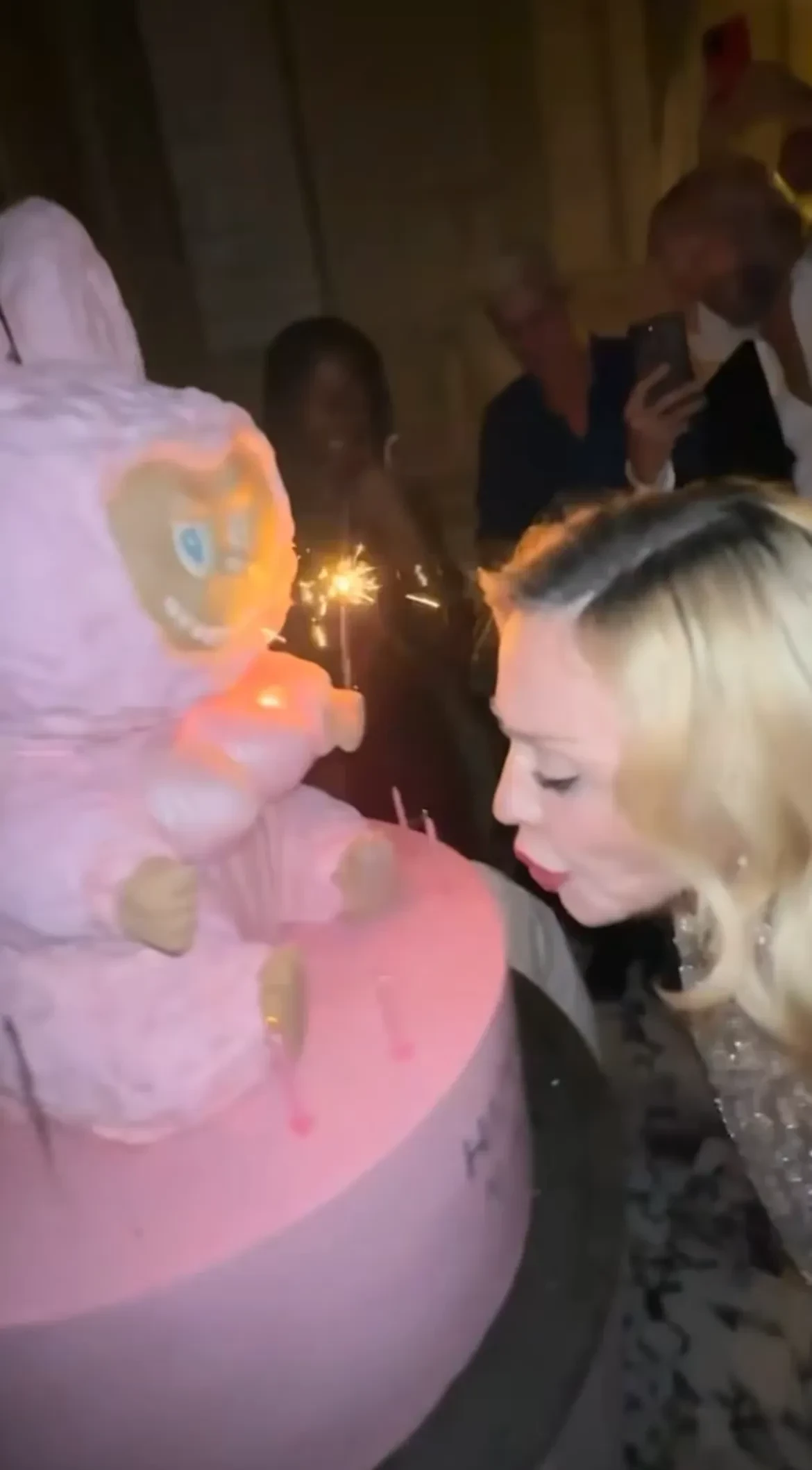 Мадонна с детьми Рокко, Мерси и ЛурдесСам праздник звезда отметила шумной вечеринкой, на которой собрались её друзья, бойфренд Аким Моррис и дети: 28-летняя дочь Лурдес, 25-летний сын Рокко, 19-летний Дэвид Банда, 19-летняя Мерси и 13-летние близнецы Стелла и Эстер. Певица предстала перед гостями в шёлковом тренче и платье, которое позже сменила на кружевной корсет. Она дополнила образ красной помадой на губах и кружевными перчатками. Праздничный торт у звезды был необычный — в форме популярной этим летом игрушки Лабубу, на котором было написано "С днём рождения, Мадуду".