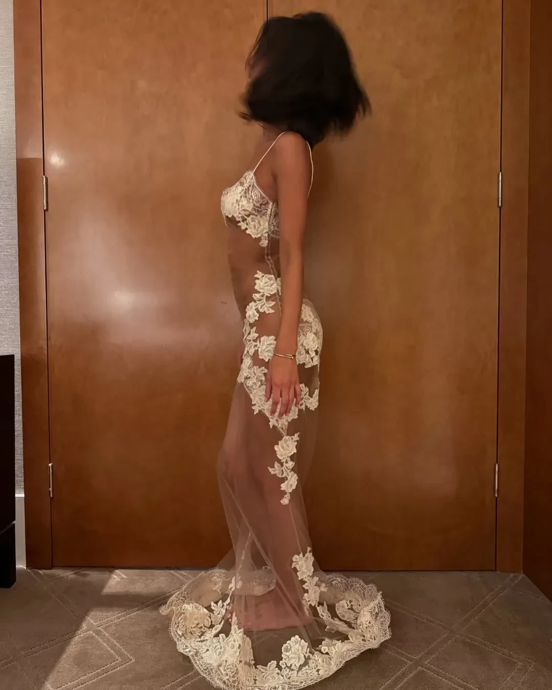 В своём инстаграме* 21-летняя Анджелина выложила видео, в котором позирует в платье американского бренда Mirror Palais с кружевом в области груди и прозрачными вставками.
