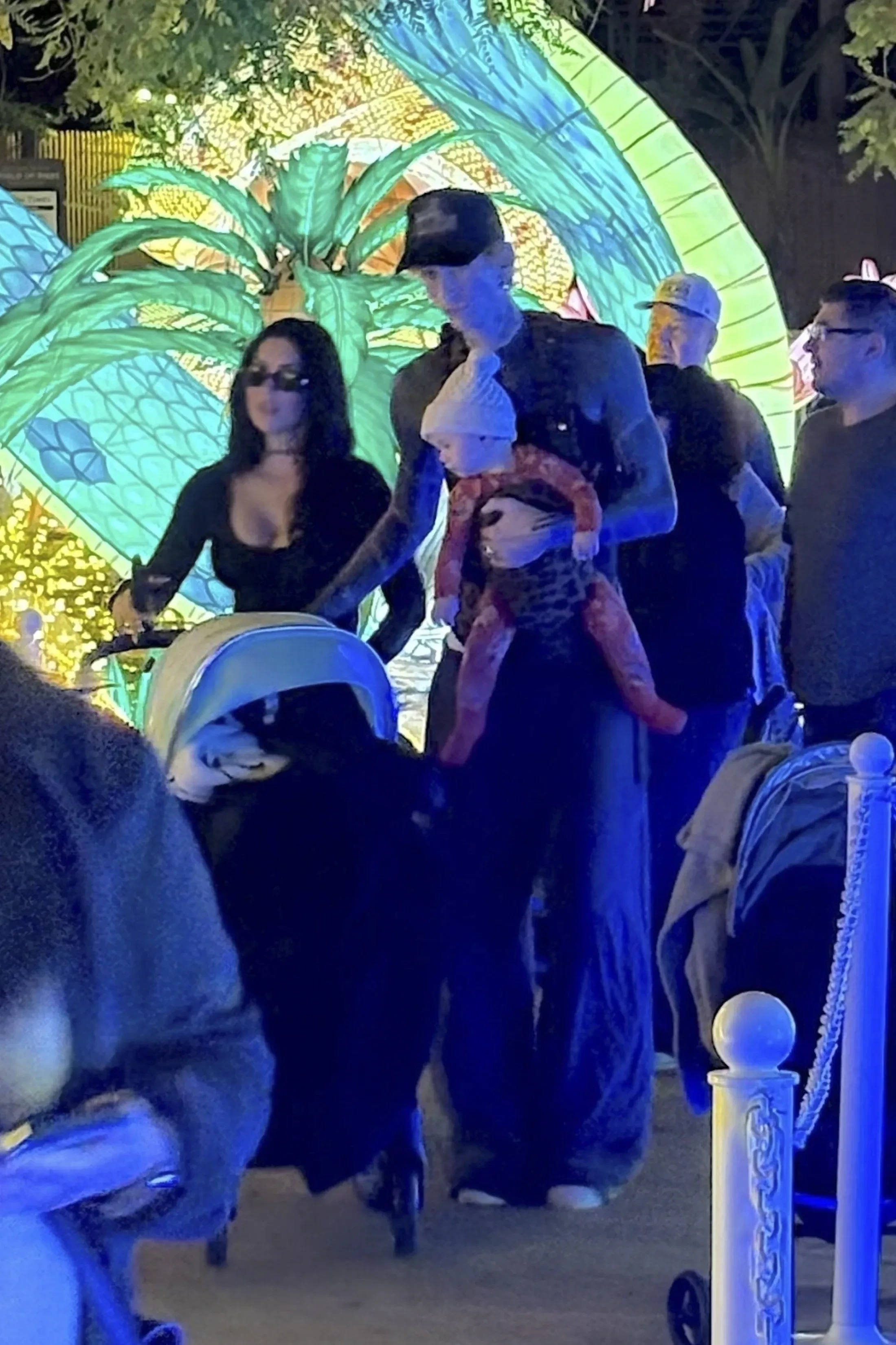 39-летняя Фокс толкала перед собой детскую коляску, а 35-летний музыкант, настоящее имя которого Колсон Бэйкер, нёс в слинге дочь. В какой-то момент пара остановилась, чтобы попозировать для совместного снимка возле одной из декораций.