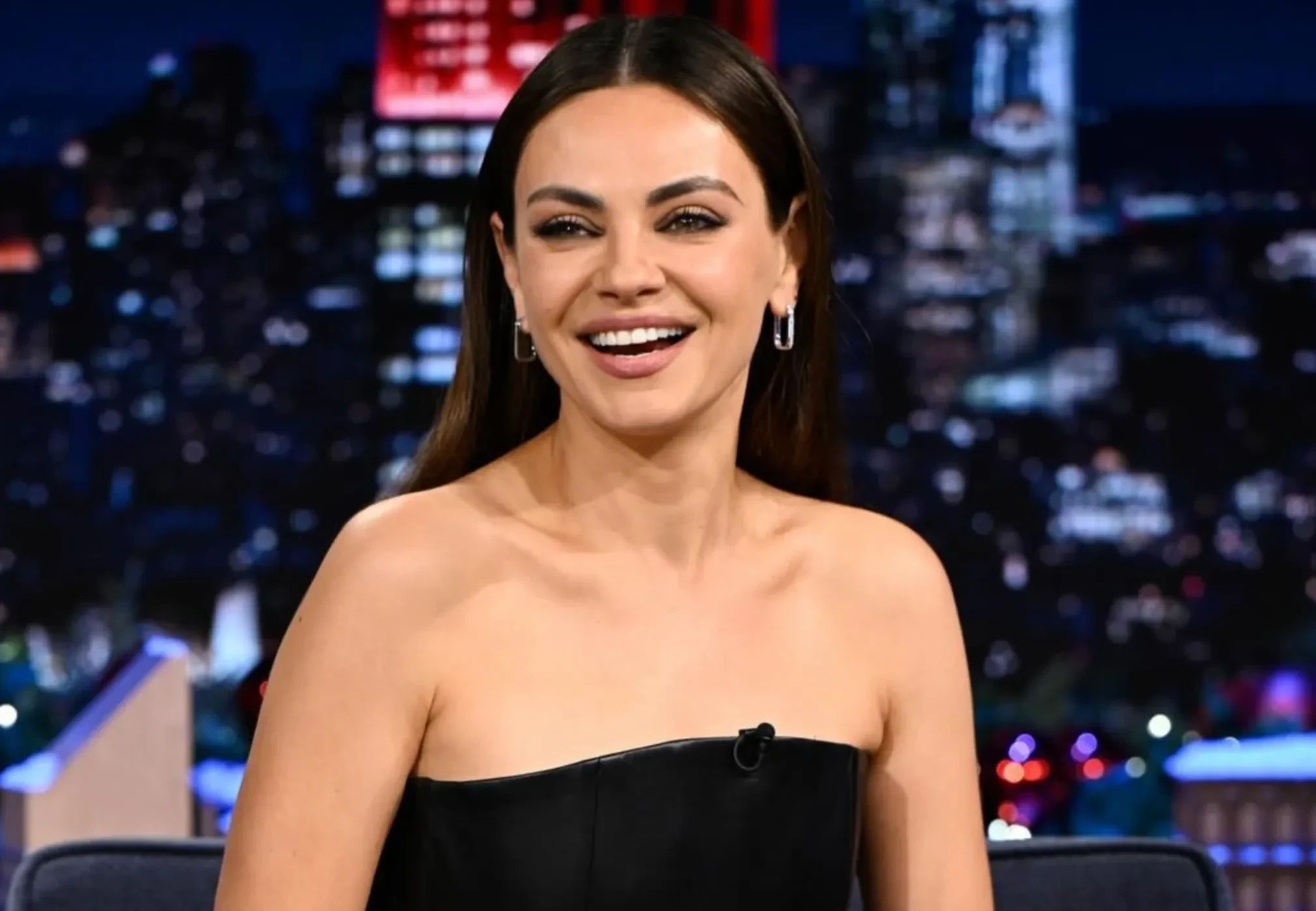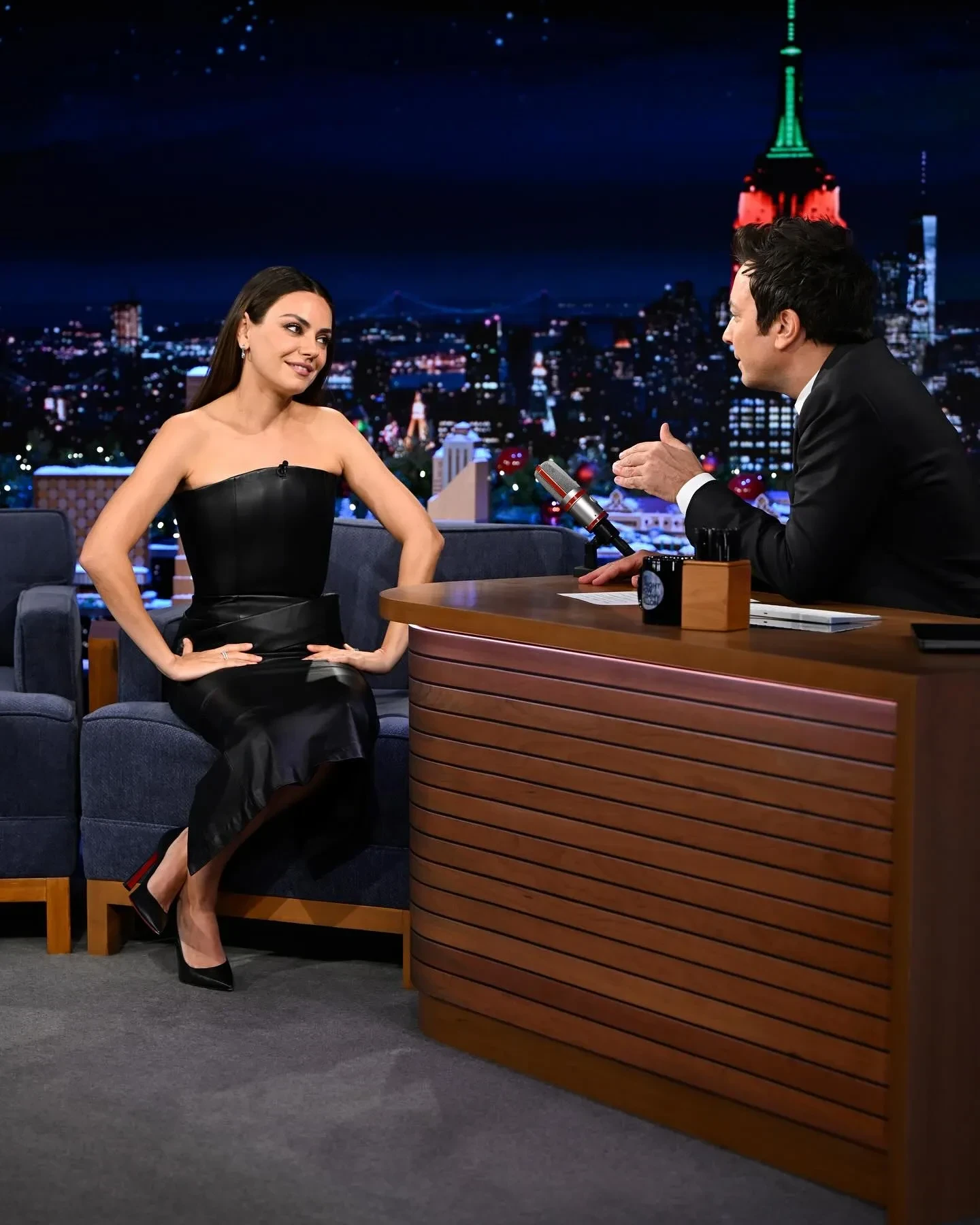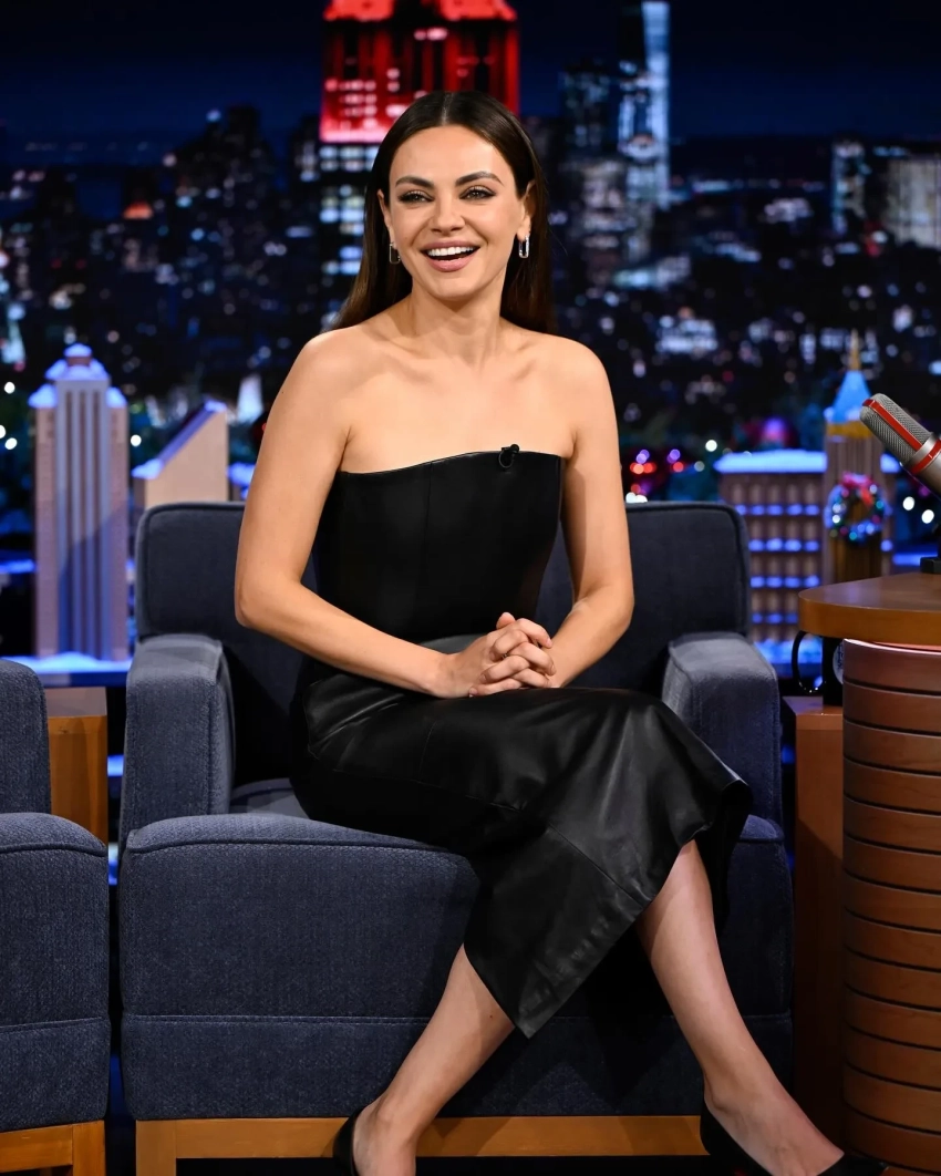 Мила Кунис посетила вечернее шоу Джимми Фэллона The Tonight Show, где представила свой новый фильм "Достать ножи: Проснись, мертвец". В студии 42-летняя актриса появилась в обтягивающем кожаном платье в стиле "доминатрикс", дополнив образ минималистичными украшениями и чёрными туфлями на шпильке.
