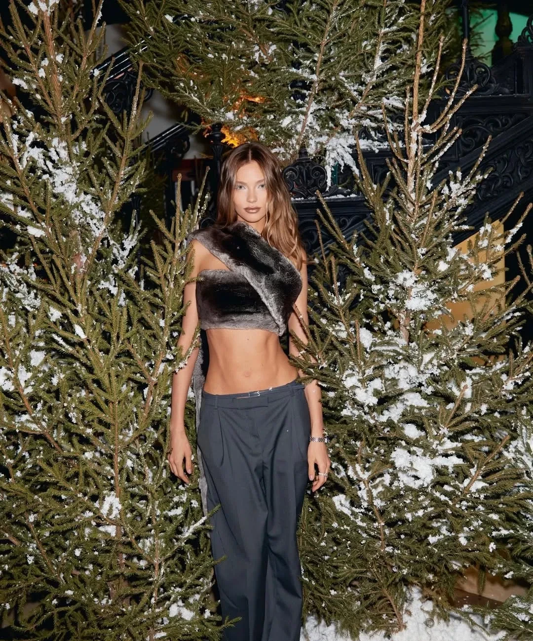 Алеся Кафельникова посетила рождественский ужин сервиса "Яндекс Книги". 27-летняя модель пришла на мероприятие с обнажённым животом в меховом топе от Александра Терехова и в брюках на низкой посадке. Образ дополнили "зимний" макияж, часы и кольцо Cartier с бриллиантами.
