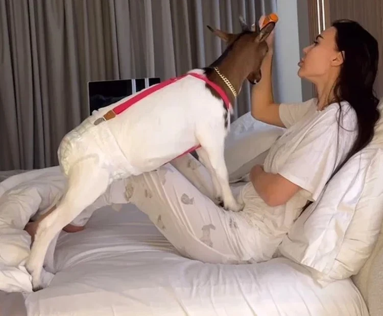 Дома блогера встретила ее 10-летняя дочь Лея в фиолетовой пижаме. Девочка пожаловалась, что у нее температура 37, но ей уже стало лучше. И пока дети лечатся, Оксана решила сделать массаж своей козе Мими. Самойлова, лежа на кровати, массировала морду животного специальным устройством. Примечательно, что коза стояла в памперсе, который был закреплен розовыми подтяжками.