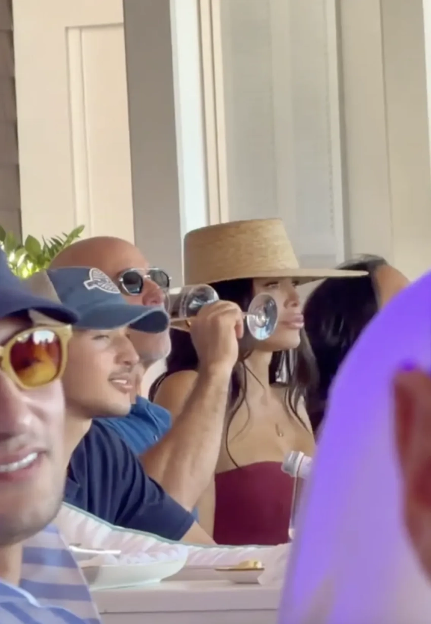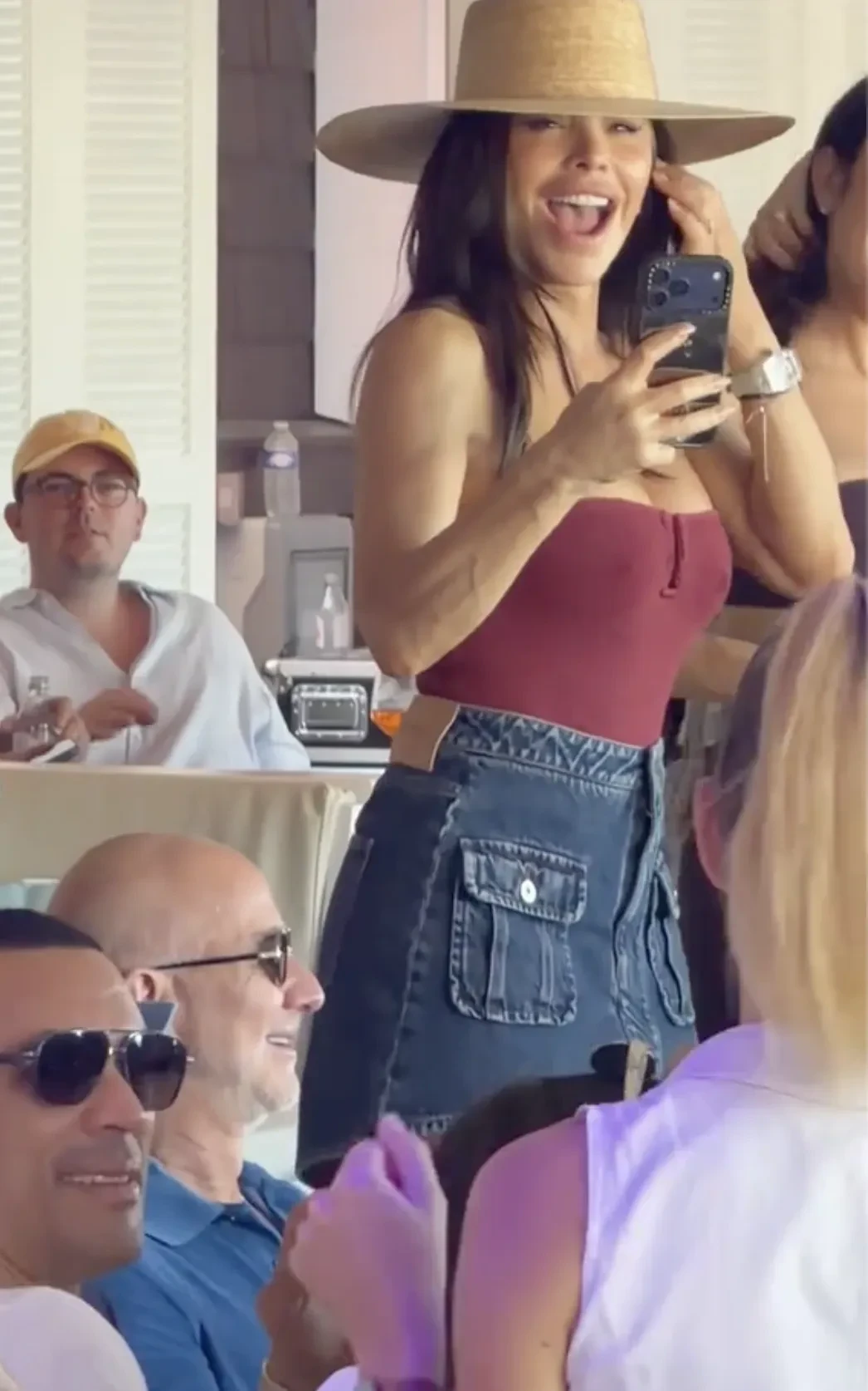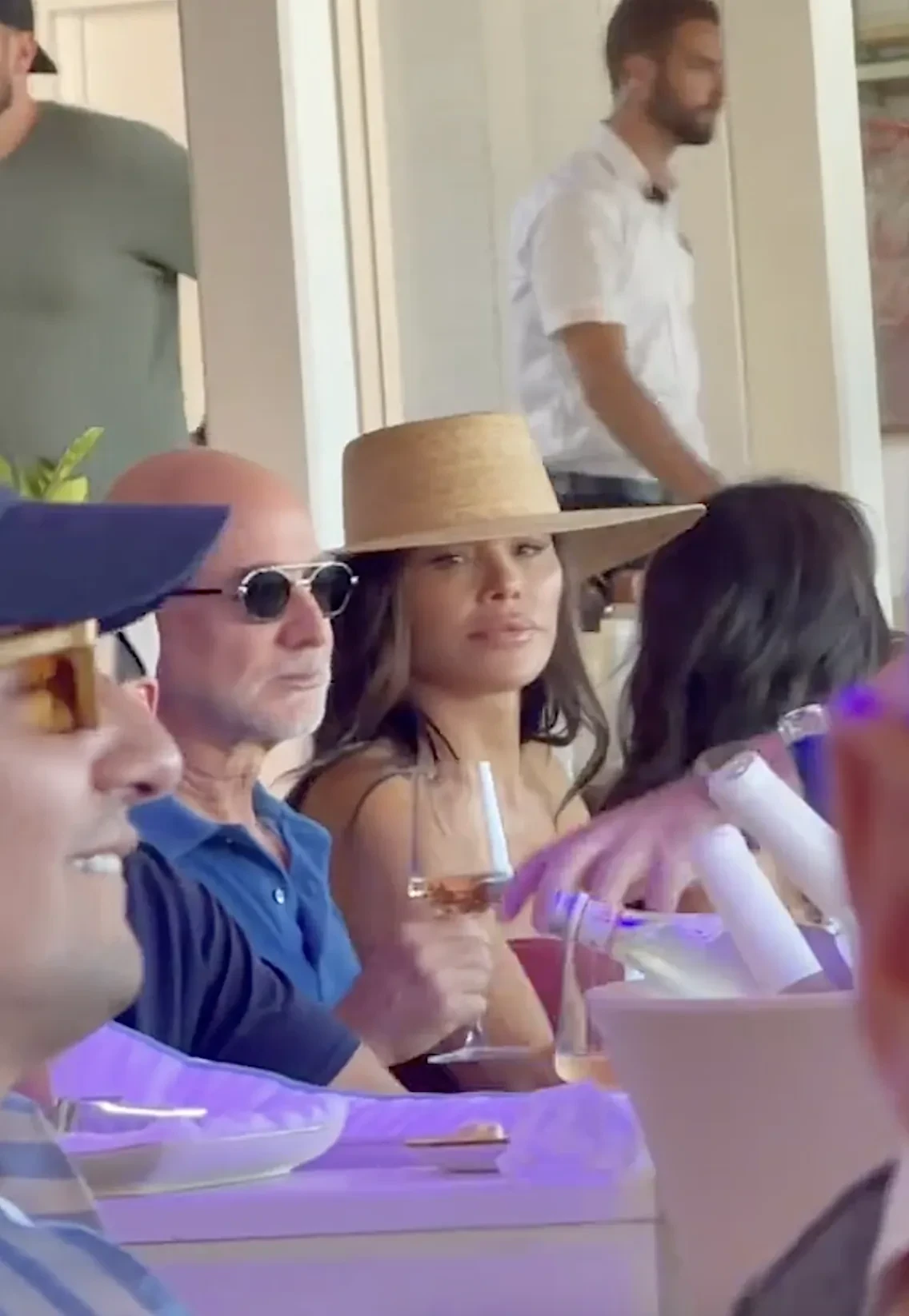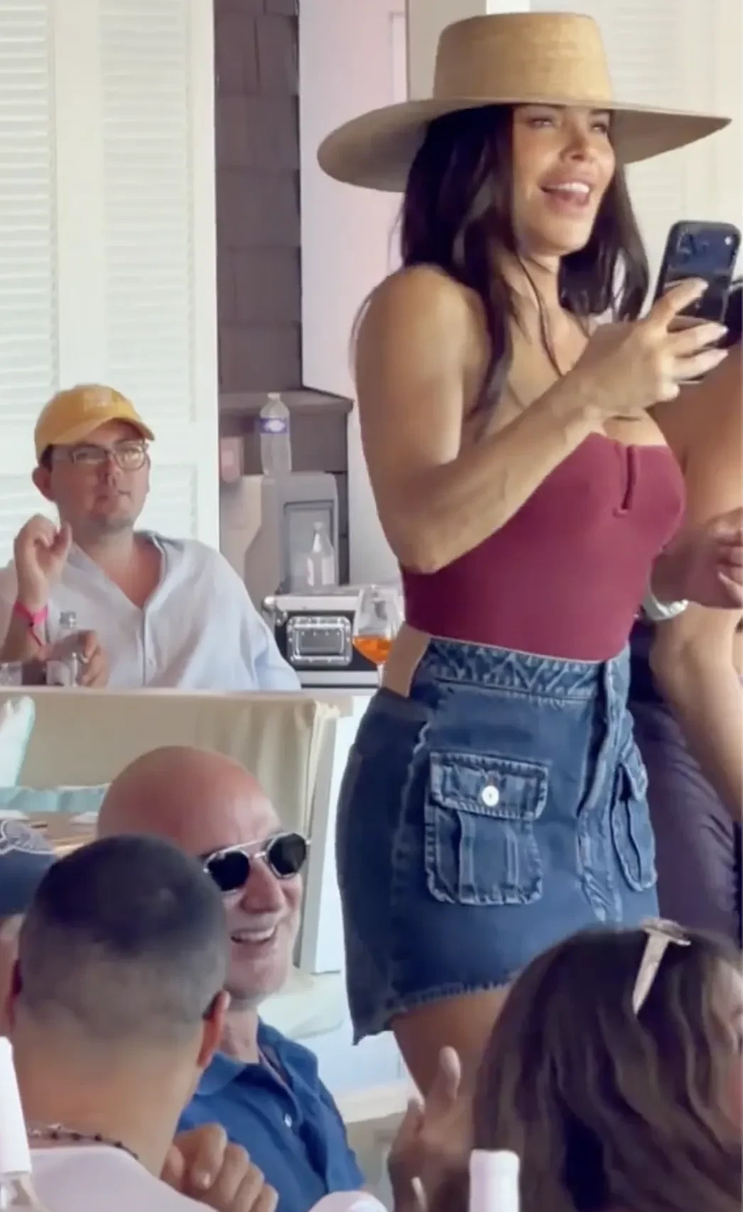 Безос и Санчес сидели за общим столом, общались с друзьями и пили вино, а спустя время супруга миллиардера решила станцевать на стуле. Она была одета в джинсовую мини-юбку, топ без бретелей и шляпу.