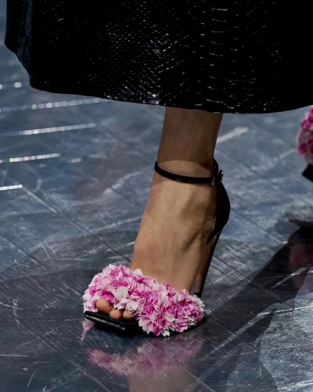 Сандэй Роуз появилась перед камерами в длинном чёрном пальто с текстурой под кожу крокодила, украшенном крупной сиреневой орхидеей на лацкане. Для показа она сменила цвет волос на более тёмный с красноватым оттенком.
