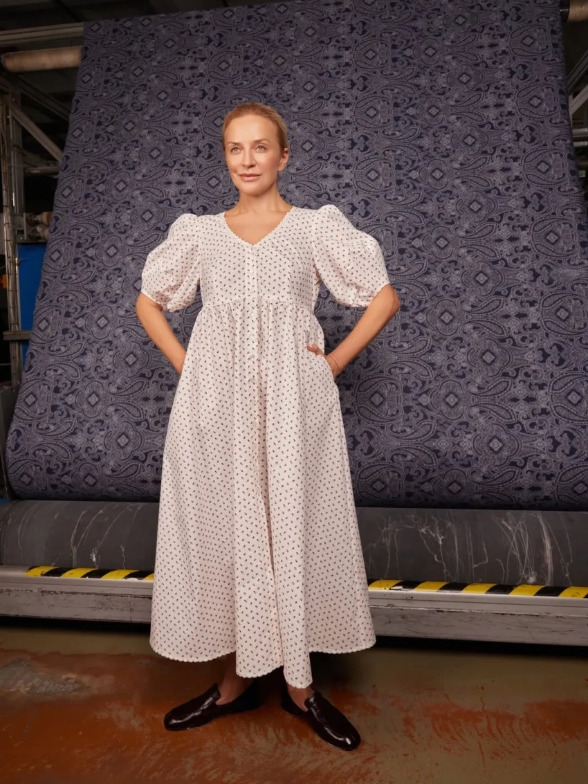 Шелягова примерила фартуки, платья и сарафаны с уникальными принтами, которые были специально отобраны и воссозданы художниками Шуйской фабрики по архивным образцам XVIII—XIX веков и перенесены на современный ситец.
