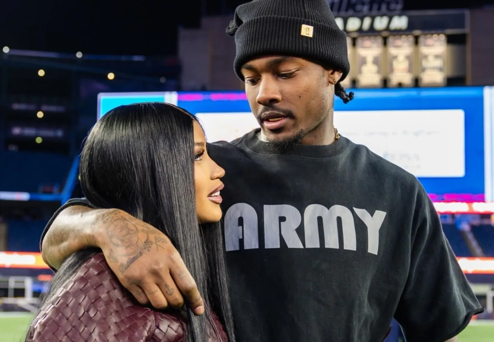 Стефон Диггз и Карди БиПоклонники заподозрили проблемы в отношениях пары вскоре после Суперкубка-2026. Сигналами стали, во-первых, их взаимные отписки в соцсетях, а во-вторых, тот факт, что Карди не поддержала Стефона во время матча. На вопрос журналистов о том, есть ли у неё слова поддержки для бойфренда, она ответила лишь "Удачи" и поспешила уйти.
