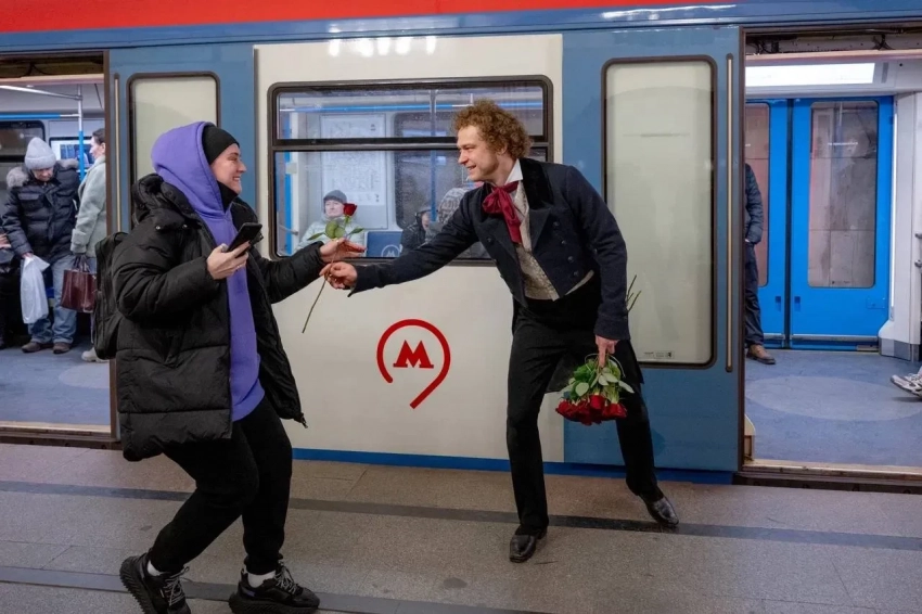 32-летний Борисов в кудрявом парике и фраке раздал пассажиркам метрополитена красные розы. Он также сфотографировался на фоне бюста Пушкина, установленного на одноимённой станции. Судя по опубликованному видео, появление актёра стало неожиданностью для многих.