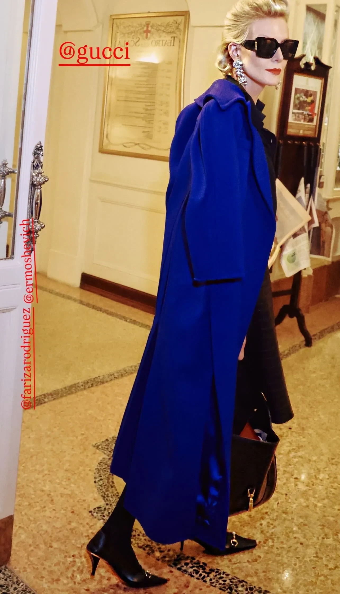 Фото Ренаты ЛитвиновойТакже Рената Литвинова показала второй образ Gucci, который она примеряла незадолго до показа. Актриса позировала в синем пальто, кожаной юбке и блузе с декольте, которую украшает брошь в тон серьгам.