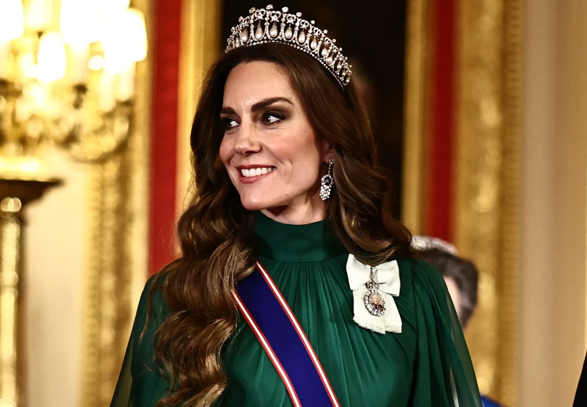Кейт МиддлтонТем временем королева Камилла надела белое платье с вышивкой от Фионы Клэр. Она дополнила наряд бельгийской сапфировой тиарой, в которой уже была на банкетах в честь визитов президентов Франции и США, а также бриллиантовым колье в форме змеи.