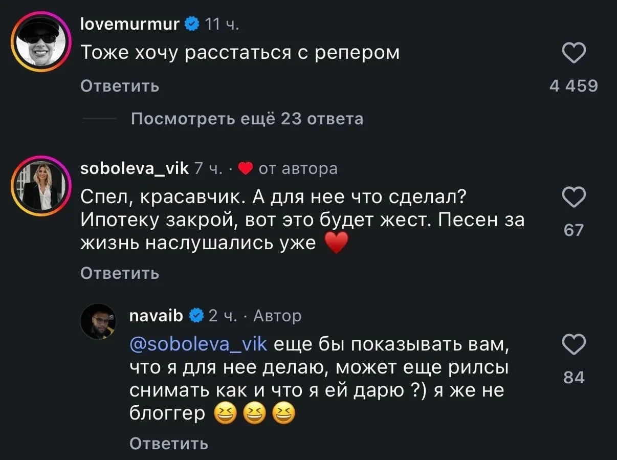 Вместе с тем комментариях под новым треком разгорелся спор. Одни растроганы посвящением трека — Карина Мурашкина, например, написала, что тоже хотела бы "расстаться с рэпером", — другие заняли прагматичную позицию: мол, лучше бы Navai деньгами помог, чем песни писал. "Спел, красавчик. А для неё что сделал? Ипотеку закрой, вот это будет жест", — один из таких комментариев.