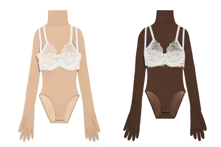 Демна Гвасалия уже подготовился к теплому сезону и представил весенне-летнюю коллекцию от Balenciaga. Особого внимания заслуживает боди, имитирующее человеческую кожу (светлую и темную — на выбор), а сверху надет жуткий кружевной лифчик, который как будто позаимствовали из бабушкиного сундука. Цена очередного безумного творения Демны примерно 310 000 рублей.