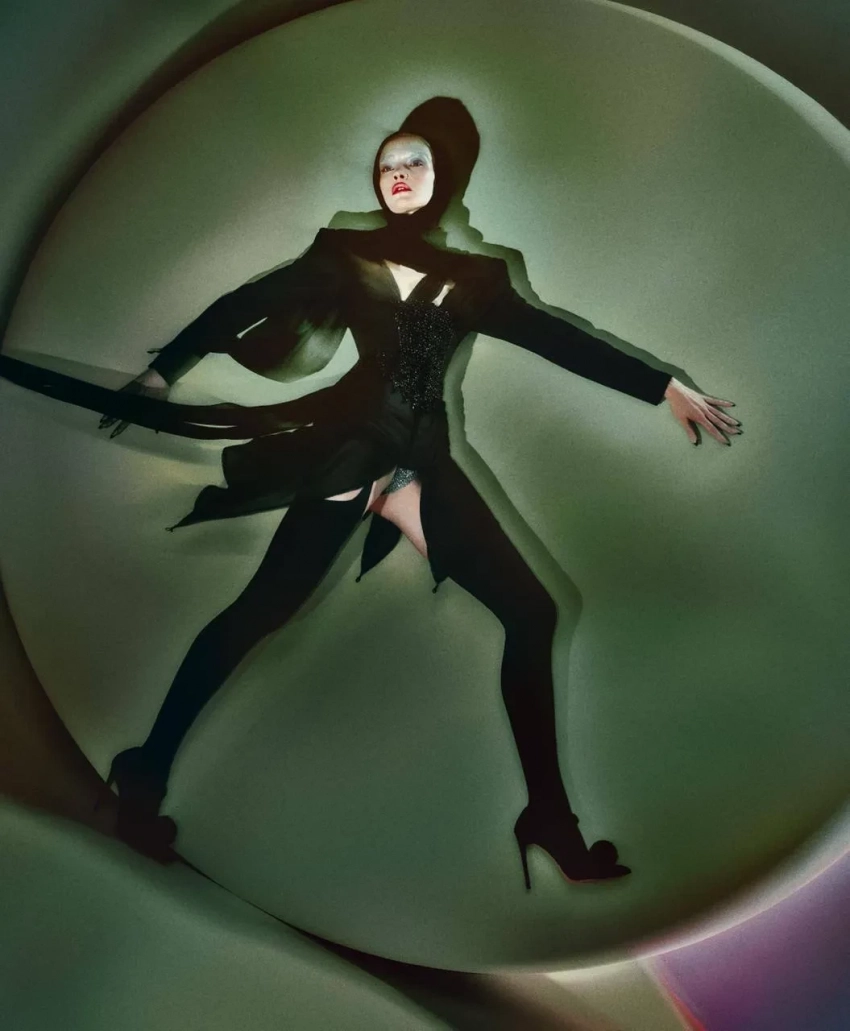 На снимках Наталья предстает в образах, навеянных атмосферой кабаре и ретро-цирка. В объективе Елизаветы Породиной модель позирует в платьях, созданных с использованием ручной вязки и бисера, в атласном кутюрном макси и в мини, напоминающем кольчугу, с жемчужными бусинами. Но главным украшением коллекции стала алая цветочная накидка из сетки, украшенная шифоновыми соцветиями и полностью расшитая жемчугом и кристаллами.