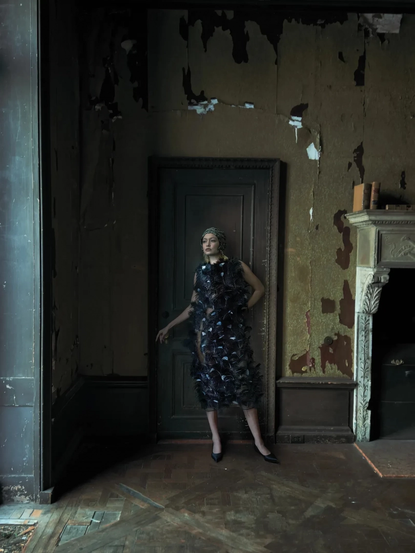 Джиджи позировала в объективе фотографа Энни Лейбовиц. На обложке 29-летняя модель появилась в прозрачном платье с цветочным принтом бренда Valentino. Также Хадид предстала в нескольких образах: в куртке и юбке Chanel, в платье в пол Dior, в платье из перьев Prada и в кремовом платье с открытой спиной бренда Miu Miu.