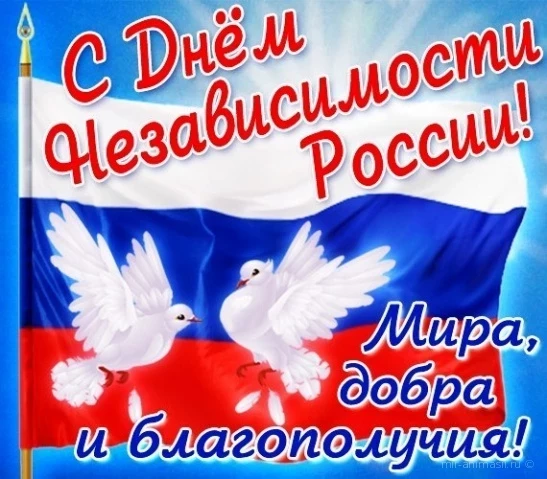 Сегодня день великой страны, День России. И в этот светлый день хочется нам всем пожелать гордиться тем, что мы россияне. Пусть каждый человек чувствует себя свободным, счастливым, нужным и уважаемым. Пусть никакие войны, стихийные бедствия, экономические кризисы не касаются нас. Желаю всем процветания, благополучия, достатка. С праздником всех нас!
