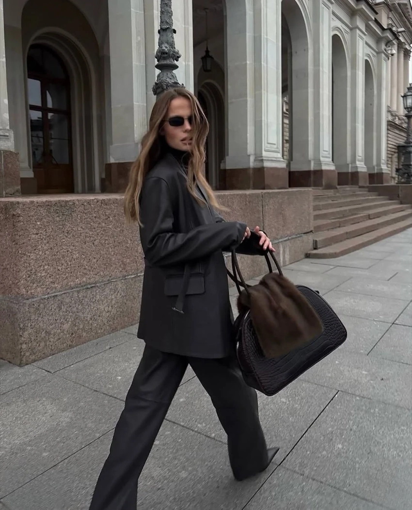 Её фишка — двойная сущность: модель можно носить кожаной стороной или тканевой, меняя настроение образа.