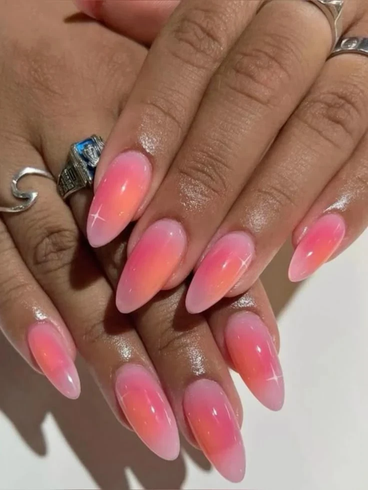 Плавные, едва заметные переходы — хит сезона. Забудь о контрастах: тренд — это мягкое перетекание от молочного к персиковому или от розового к нюду. Такой маникюр выглядит естественно и дорого, подчеркивая ухоженность рук.